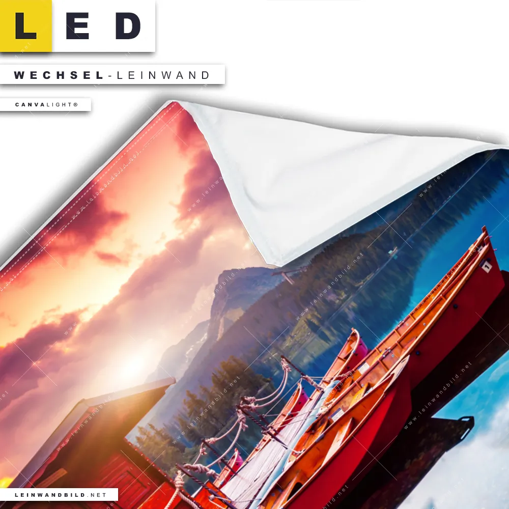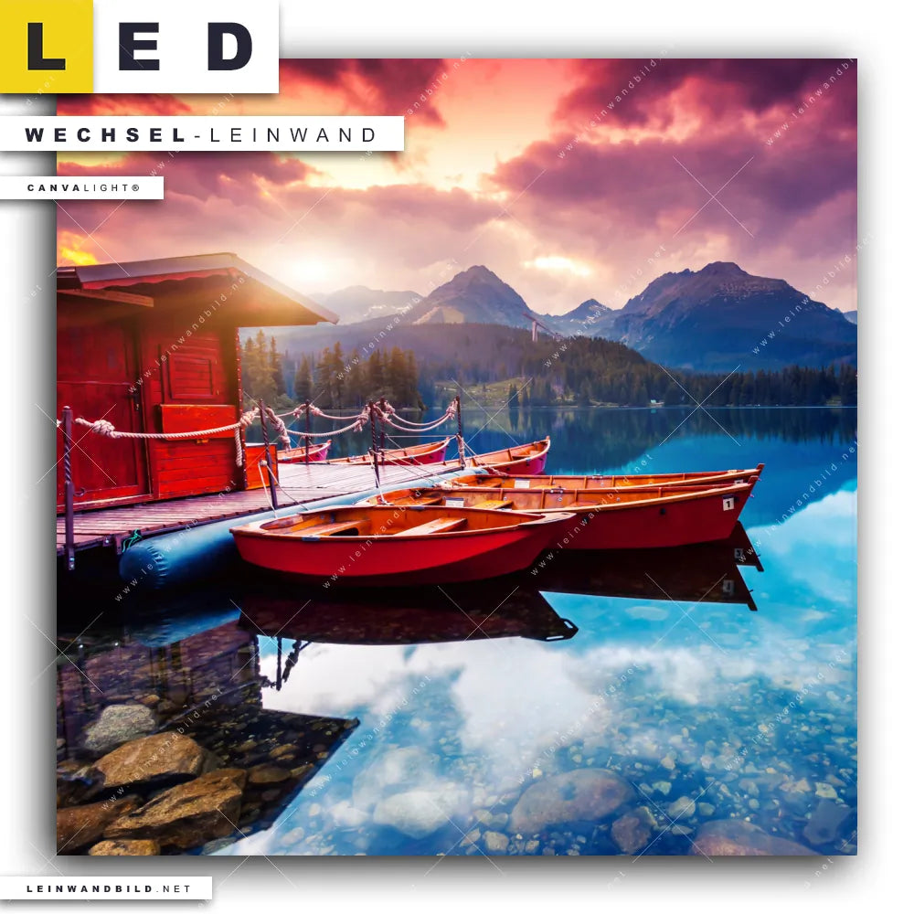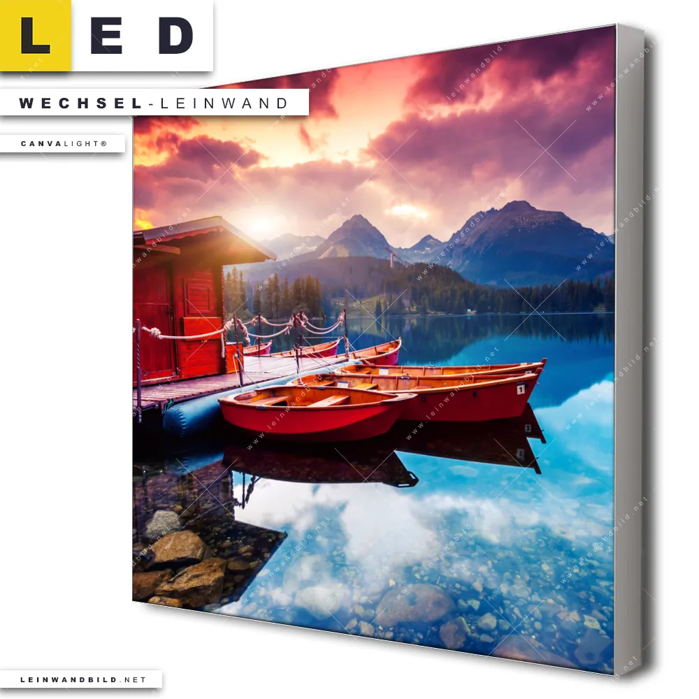 Du bist auf der Suche nach einer Landschaften Wechsel-Leinwand für Dein LED-Leinwandbild im Quadratischen Format? Begriffe wie Natur, Stille, See, Wasser, Berge, Sonnenuntergang, Sonnenaufgang, Sonne, Gebirge, Boote, Boot, Bergsee, Urlaub, Reisen, Steg haben Dich auf der Suche nach Deiner Ersatz-Leinwand für dein LED Wandbild mit wechselbarer Leinwand inspiriert? Farben wie Orange, Blau, Rot dürfen auf Deinem neuen Wechselmotiv für Dein XXL Leinwand-LED-Bild nicht fehlen und Leinwände im Natürlich - Realistisch, Mixed Media Stil für Leuchtbilder passen perfekt zu Deinem Einrichtungsstil?
