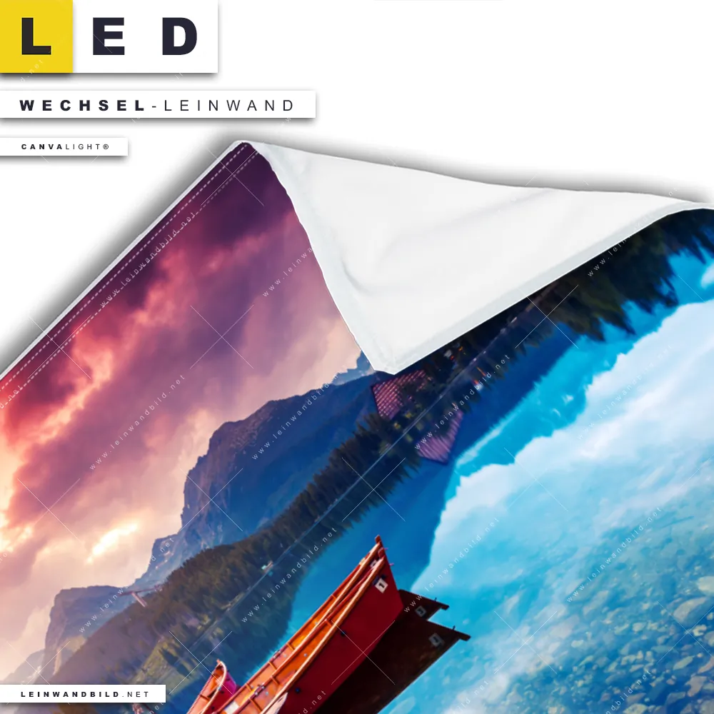 Du bist auf der Suche nach einer Landschaften Wechsel-Leinwand für Dein LED-Leinwandbild im Querformat? Begriffe wie Natur, Stille, See, Wasser, Berge, Sonnenuntergang, Sonnenaufgang, Sonne, Gebirge, Boote, Boot, Bergsee, Urlaub, Reisen, Steg haben Dich auf der Suche nach Deiner Ersatz-Leinwand für dein breites LED Wandbild mit wechselbarer Leinwand inspiriert? Farben wie Orange, Blau, Rot dürfen auf Deinem neuen Wechselmotiv für Dein XXL Leinwand-LED-Bild nicht fehlen und Leinwände im Natürlich - Realistisch, Mixed Media Stil für Leuchtbilder passen perfekt zu Deinem Einrichtungsstil?