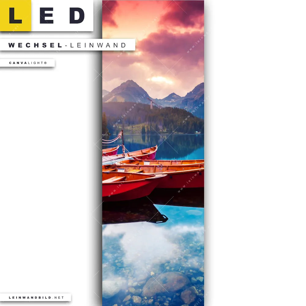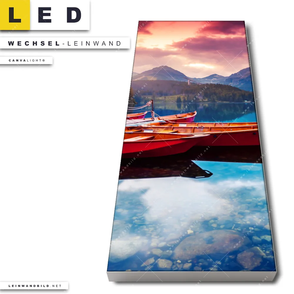 Du bist auf der Suche nach einer Landschaften Wechsel-Leinwand für Dein LED-Leinwandbild im Schmalen Format? Begriffe wie Natur, Stille, See, Wasser, Berge, Sonnenuntergang, Sonnenaufgang, Sonne, Gebirge, Boote, Boot, Bergsee, Urlaub, Reisen, Steg haben Dich auf der Suche nach Deiner Ersatz-Leinwand für dein LED Wandbild im Panorama-Hochformat mit wechselbarer Leinwand inspiriert? Farben wie Orange, Blau, Rot dürfen auf Deinem neuen Wechselmotiv für Dein XXL Leinwand-LED-Bild nicht fehlen und Leinwände im Natürlich - Realistisch, Mixed Media Stil für Leuchtbilder passen perfekt zu Deinem Einrichtungsstil?