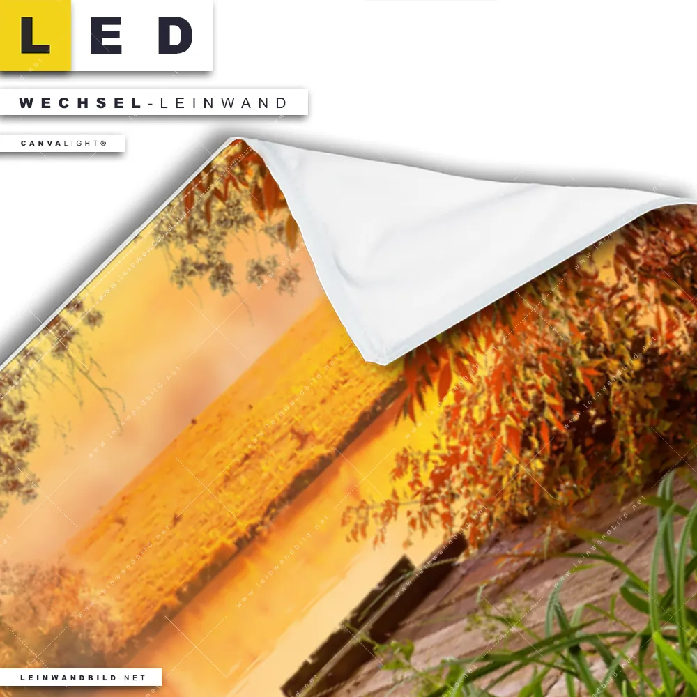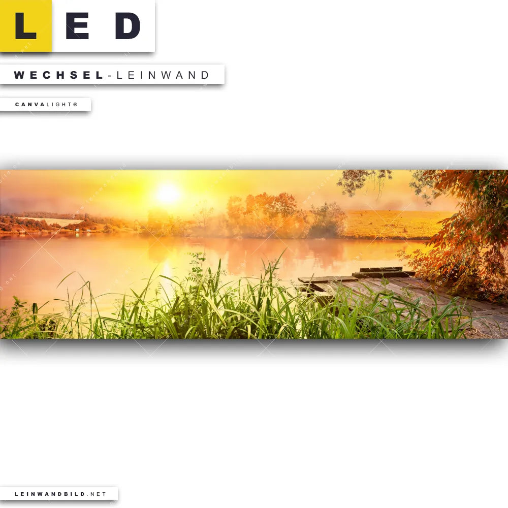 Du bist auf der Suche nach einer Landschaften Wechsel-Leinwand für Dein LED-Leinwandbild im Panorama-Format? Begriffe wie Sonnenuntergang, Sonnenaufgang, Wasser, Fluss, Nebel, Morgenstimmung, See, Steg, Angeln, Teich, Herbst, fischen haben Dich auf der Suche nach Deiner Ersatz-Leinwand für dein extra breites LED Wandbild mit wechselbarer Leinwand inspiriert? Farben wie Braun, Grün, Orange, Ocker, Beige dürfen auf Deinem neuen Wechselmotiv für Dein XXL Leinwand-LED-Bild nicht fehlen und Leinwände im Natürlich - Realistisch Stil für Leuchtbilder passen perfekt zu Deinem Einrichtungsstil?