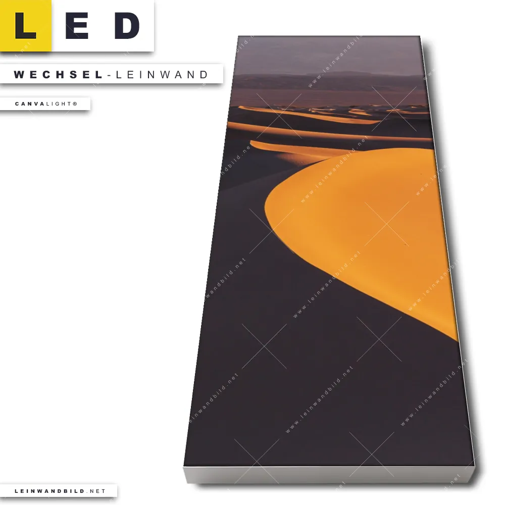 Du bist auf der Suche nach einer Landschaften Wechsel-Leinwand für Dein LED-Leinwandbild im Schmalen Format? Begriffe wie Sonnenuntergang, Sonnenaufgang, Sand, Landschaft, Urlaub, Reisen, Wüste, Düne haben Dich auf der Suche nach Deiner Ersatz-Leinwand für dein LED Wandbild im Panorama-Hochformat mit wechselbarer Leinwand inspiriert? Farben wie Orange, Schwarz, Braun, Beige, Ocker dürfen auf Deinem neuen Wechselmotiv für Dein XXL Leinwand-LED-Bild nicht fehlen und Leinwände im Natürlich - Realistisch Stil für Leuchtbilder passen perfekt zu Deinem Einrichtungsstil?