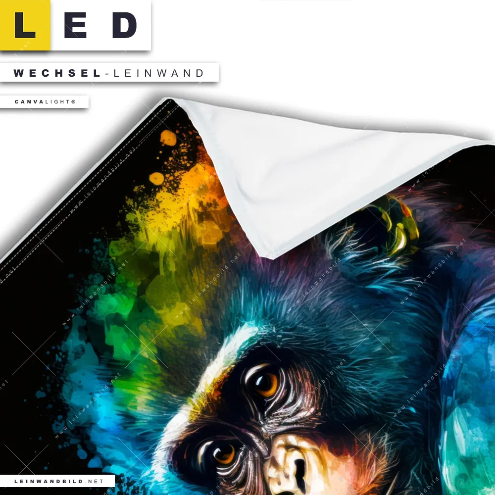Du bist auf der Suche nach einer Tierwelt Wechsel-Leinwand für Dein LED-Leinwandbild im Quadratischen Format? Begriffe wie Tier, Affe, Monkey, Chimpanzee, Schimpanse, Farbe, Farbspritzer haben Dich auf der Suche nach Deiner Ersatz-Leinwand für dein LED Wandbild mit wechselbarer Leinwand inspiriert? Farben wie Bunt, Schwarz dürfen auf Deinem neuen Wechselmotiv für Dein XXL Leinwand-LED-Bild nicht fehlen und Leinwände im Abstrakt, Modern Art, Pop Art Stil für Leuchtbilder passen perfekt zu Deinem Einrichtungsstil?