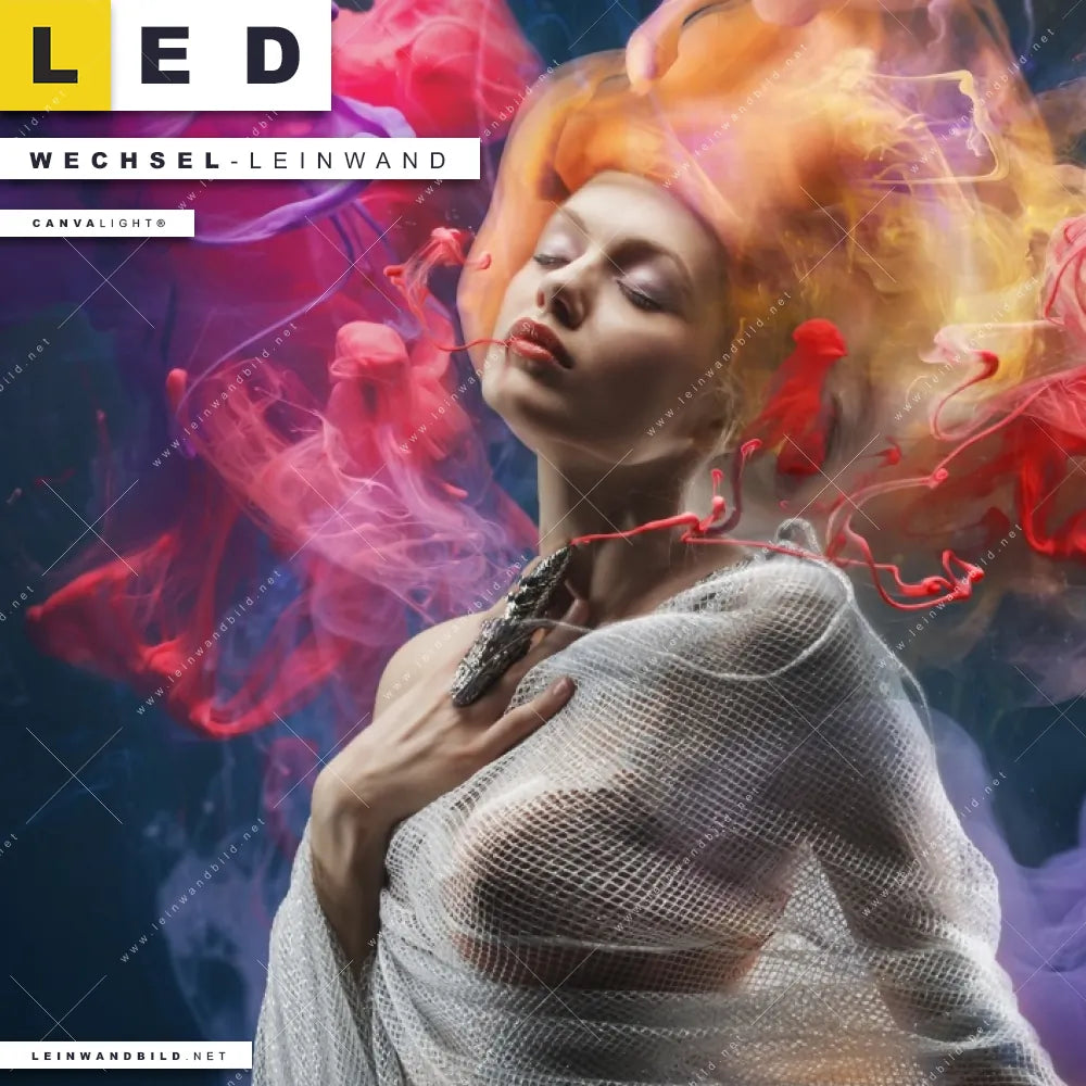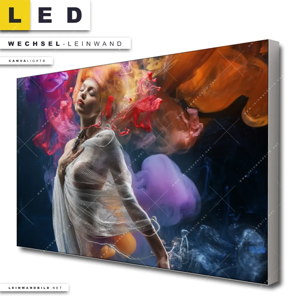 Dann sollte die Wechsel-Leinwand Canvalight® TEX | Schlafende Nixe | Querformat den Weg zu Dir finden. Die Austausch-Leinwand Nixe im Farbnebel - passend für unsere stufenlos dimmbaren, steckerfertigen Leinwandbilder im Leuchtrahmen mit Fernbedienung und optionaler Farbtemperatursteuerung - fügt sich als Eye-Catcher harmonisch in jedes Arzt - Praxis, Wohnzimmer - Schlafzimmer, Bar - Gastronomie, Friseur - Beauty Raumkonzept ein.