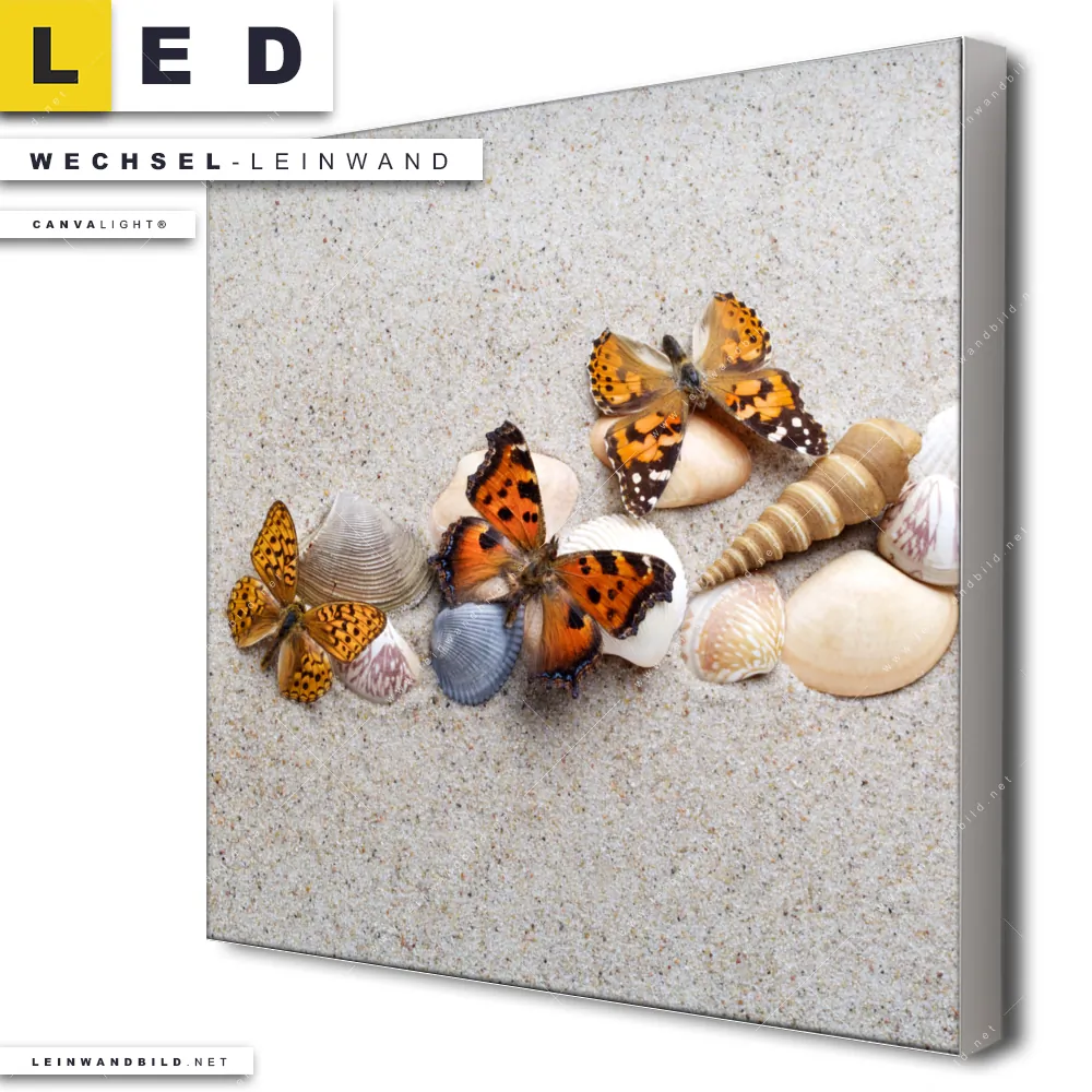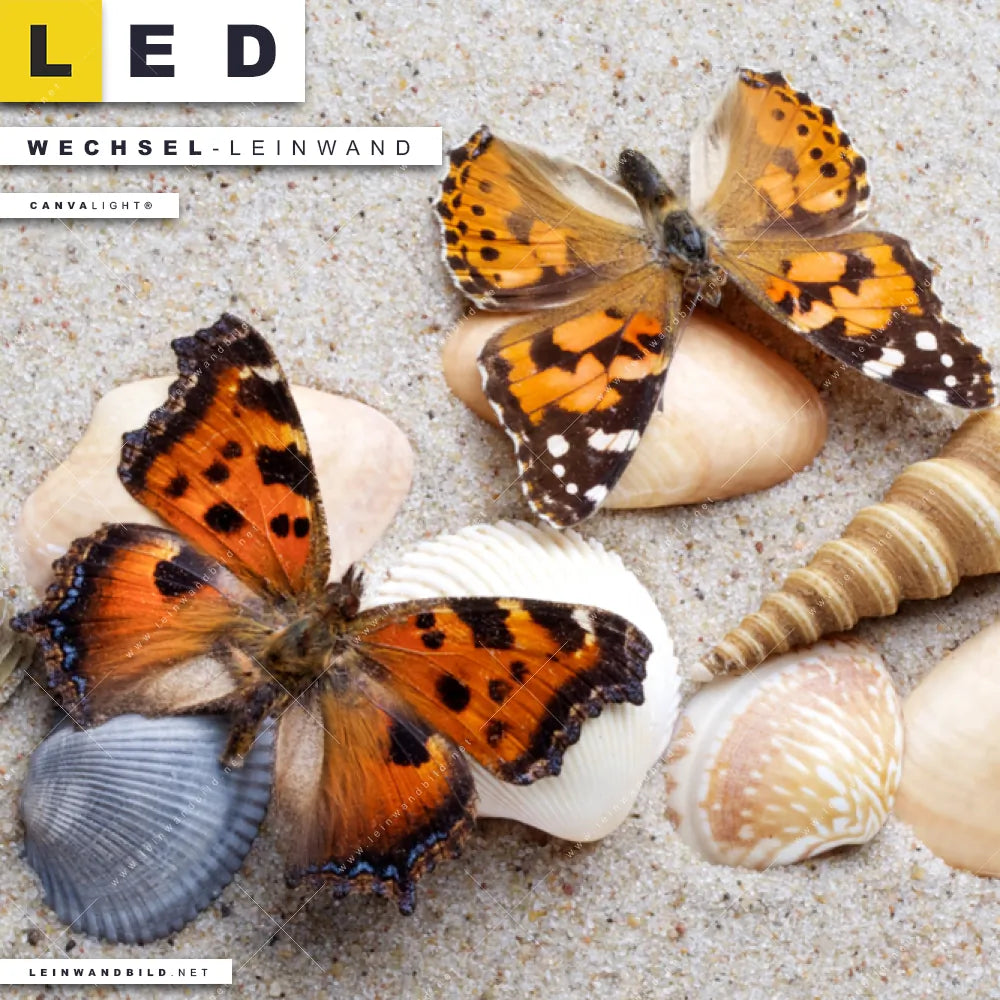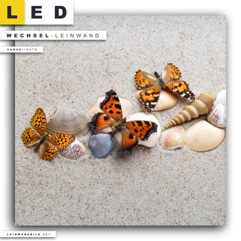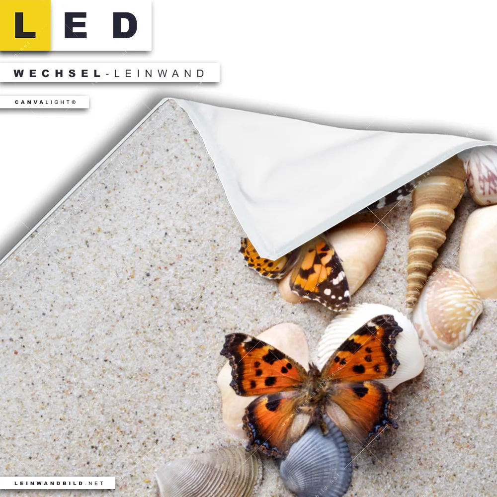 LED Wechsel-Leinwand Canvalight® TEX | Schmetterlinge & Muscheln im Sand | Quadrat