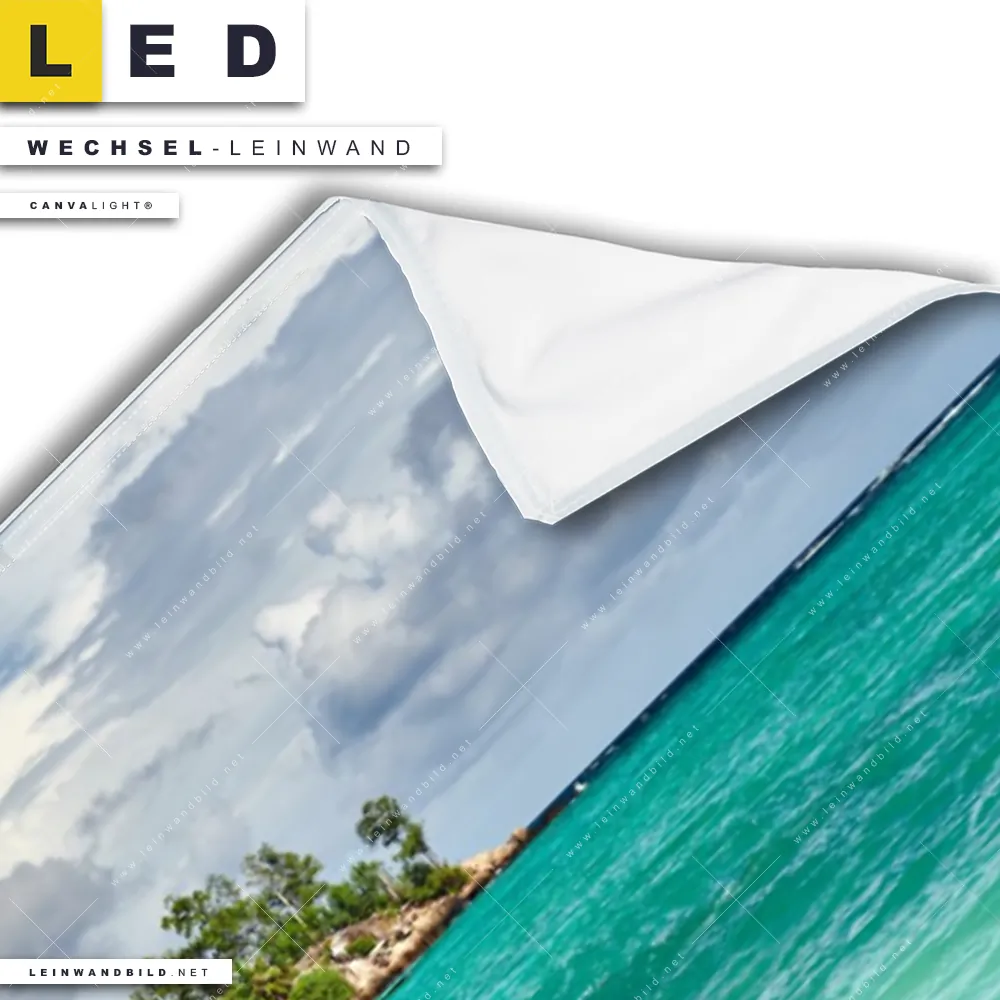 Bitte beachte, dass die Farben, der auf dem Monitor abgebildeten Seychellen - Tropische Insel Darstellung, möglicherweise von den Originalfarben deiner Canvalight® TEX Wechsel-Leinwand abweichen können.