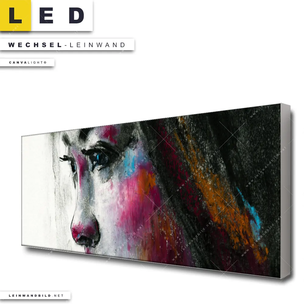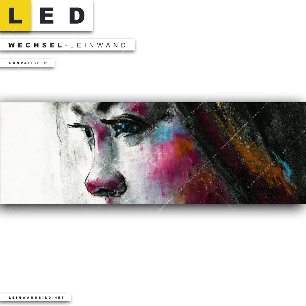 Dann sollte die Wechsel-Leinwand Canvalight® TEX | Schönes Mädchen | Panorama den Weg zu Dir finden. Die Austausch-Leinwand Zeichnung Seitenprofil einer Frau - passend für unsere stufenlos dimmbaren, steckerfertigen Leinwandbilder im LED Leuchtrahmen mit Fernbedienung und optionaler Farbtemperatursteuerung - fügt sich als Eye-Catcher harmonisch in jedes Wohnzimmer - Schlafzimmer, Bar - Gastronomie, Friseur - Beauty Raumkonzept ein.