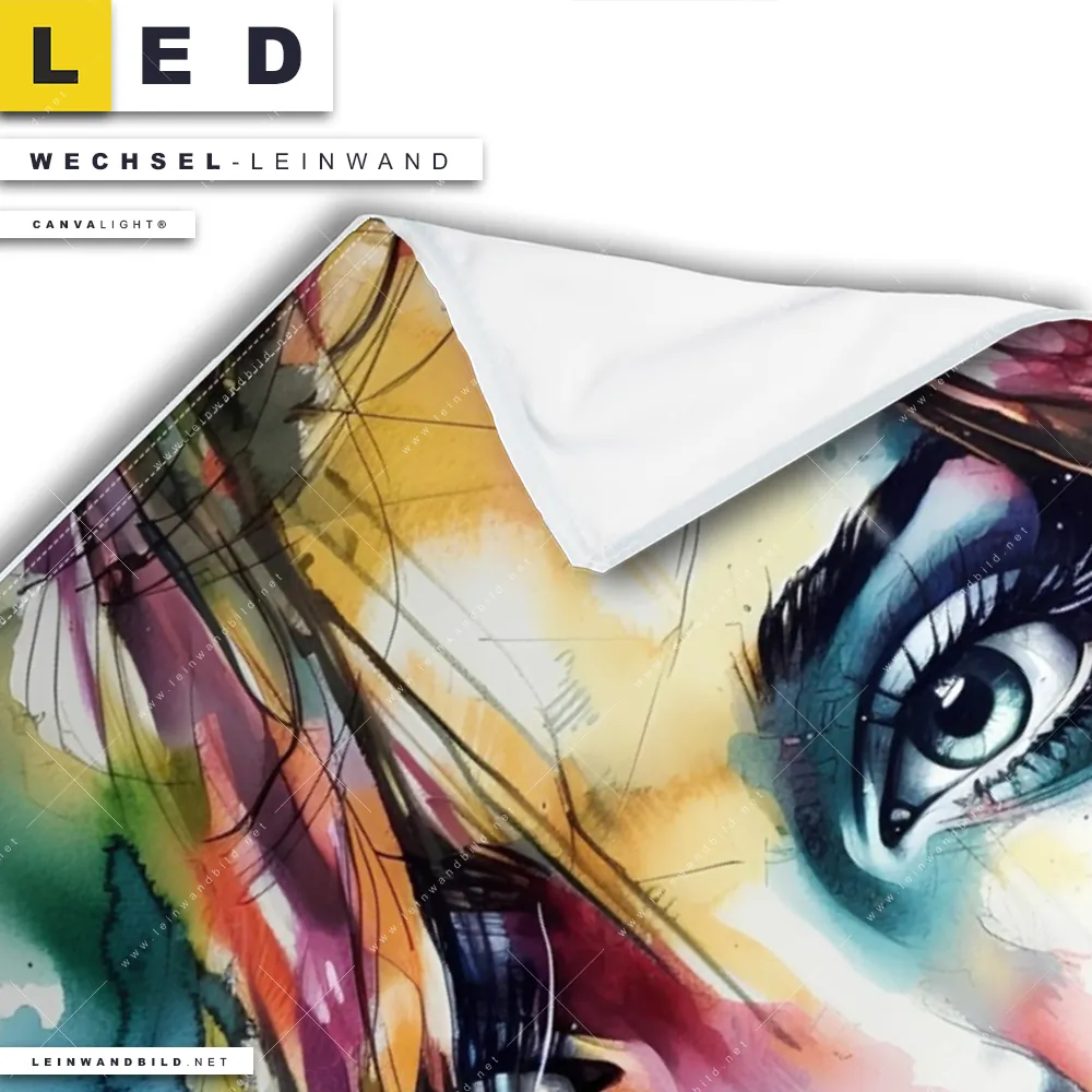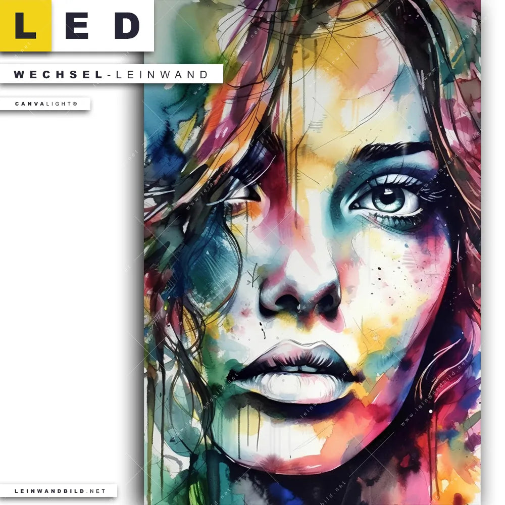 Du bist auf der Suche nach einer Porträts - Menschen Wechsel-Leinwand für Dein LED-Leinwandbild im Hochformat? Begriffe wie Frau, Portrait, Gesicht, Mädchen, Dame, Schönheit, Farbe haben Dich auf der Suche nach Deiner Ersatz-Leinwand für dein LED Wandbild mit wechselbarer Leinwand inspiriert? Farben wie Bunt dürfen auf Deinem neuen Wechselmotiv für Dein XXL Leinwand-LED-Bild nicht fehlen und Leinwände im Abstrakt, Modern Art Stil für Leuchtbilder passen perfekt zu Deinem Einrichtungsstil?