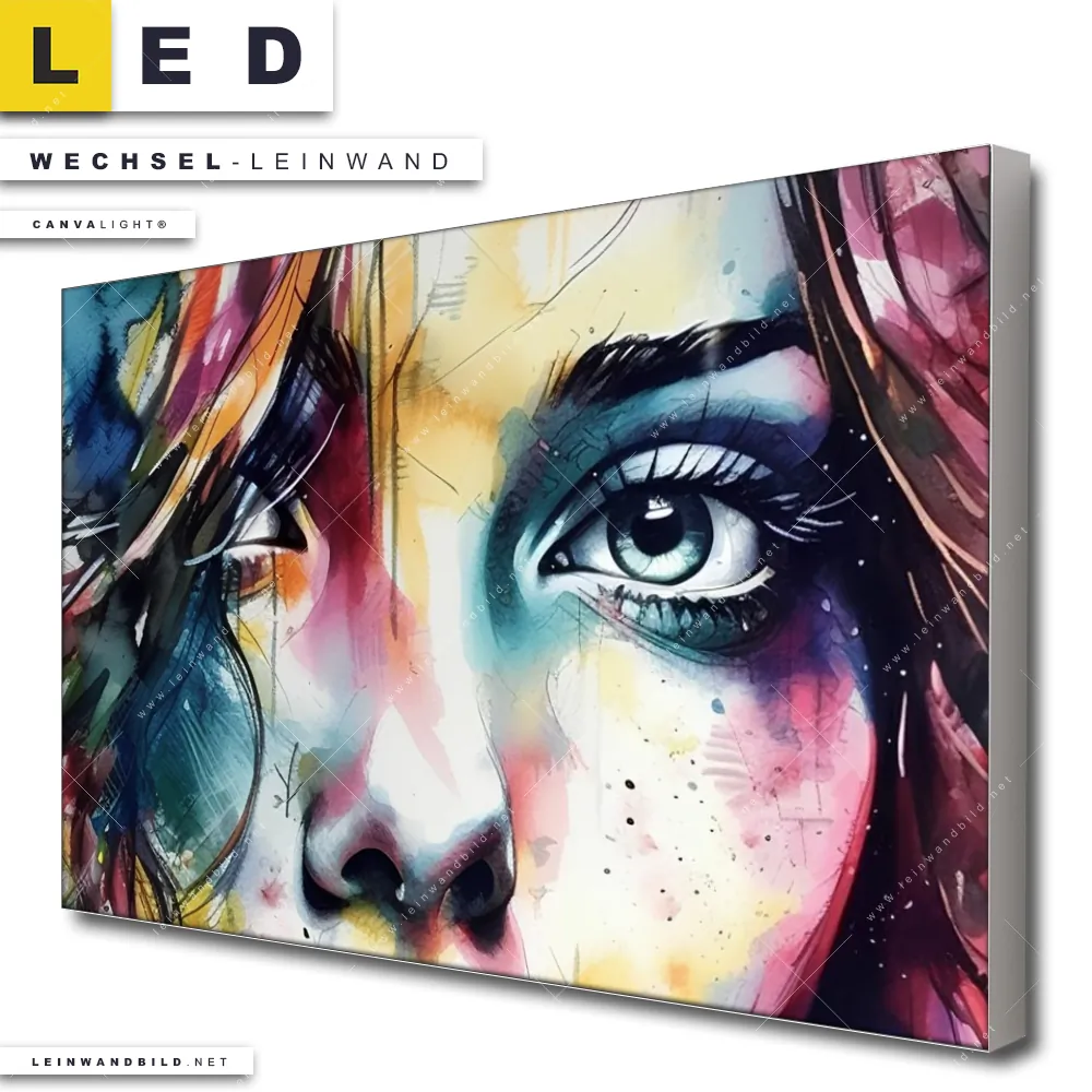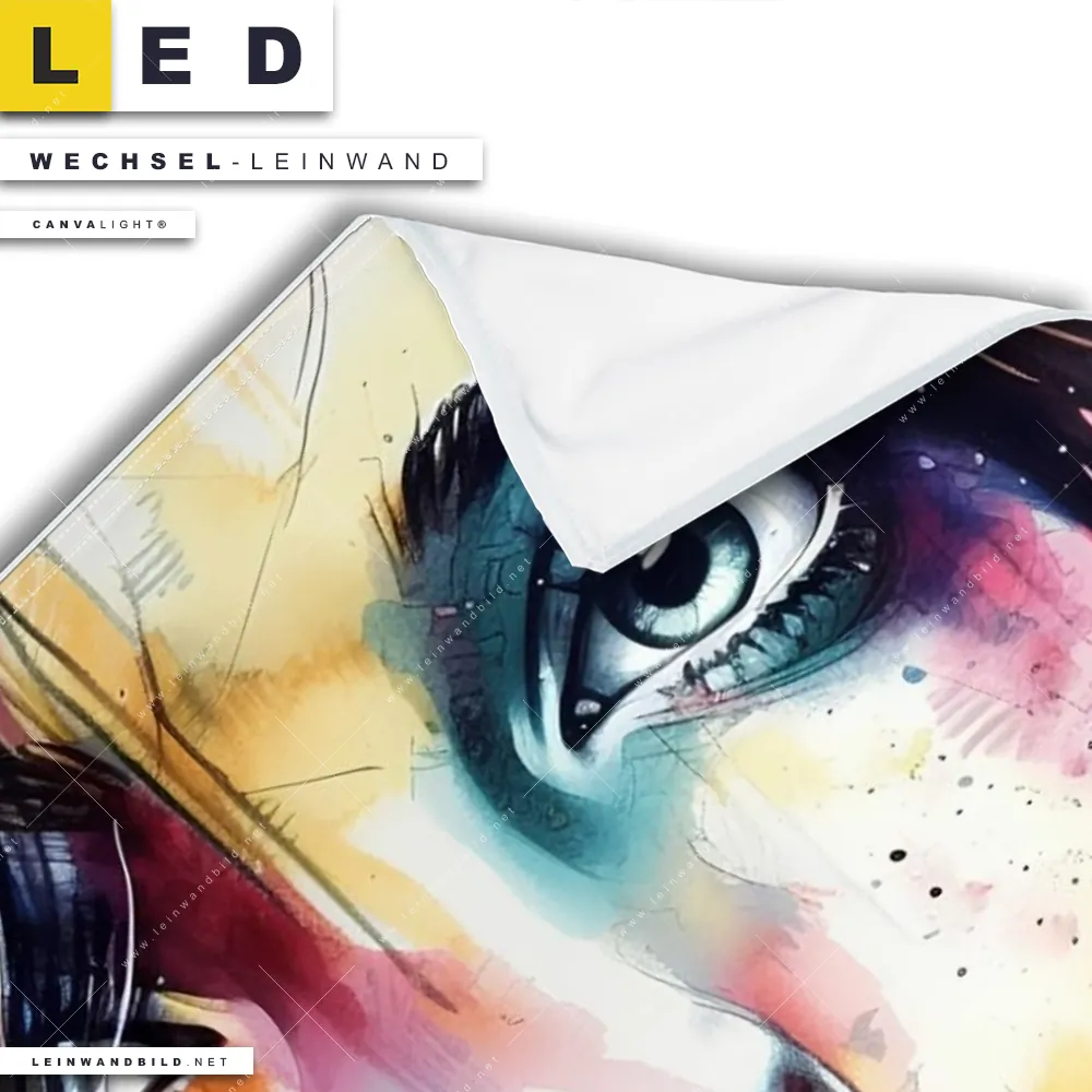 Du bist auf der Suche nach einer Porträts - Menschen Wechsel-Leinwand für Dein LED-Leinwandbild im Querformat? Begriffe wie Frau, Portrait, Gesicht, Mädchen, Dame, Schönheit, Farbe haben Dich auf der Suche nach Deiner Ersatz-Leinwand für dein breites LED Wandbild mit wechselbarer Leinwand inspiriert? Farben wie Bunt dürfen auf Deinem neuen Wechselmotiv für Dein XXL Leinwand-LED-Bild nicht fehlen und Leinwände im Abstrakt, Modern Art Stil für Leuchtbilder passen perfekt zu Deinem Einrichtungsstil?