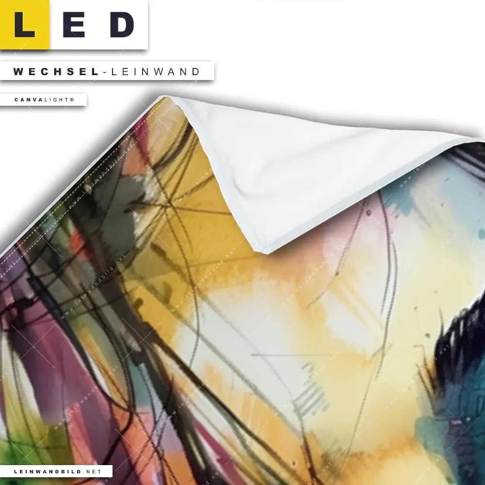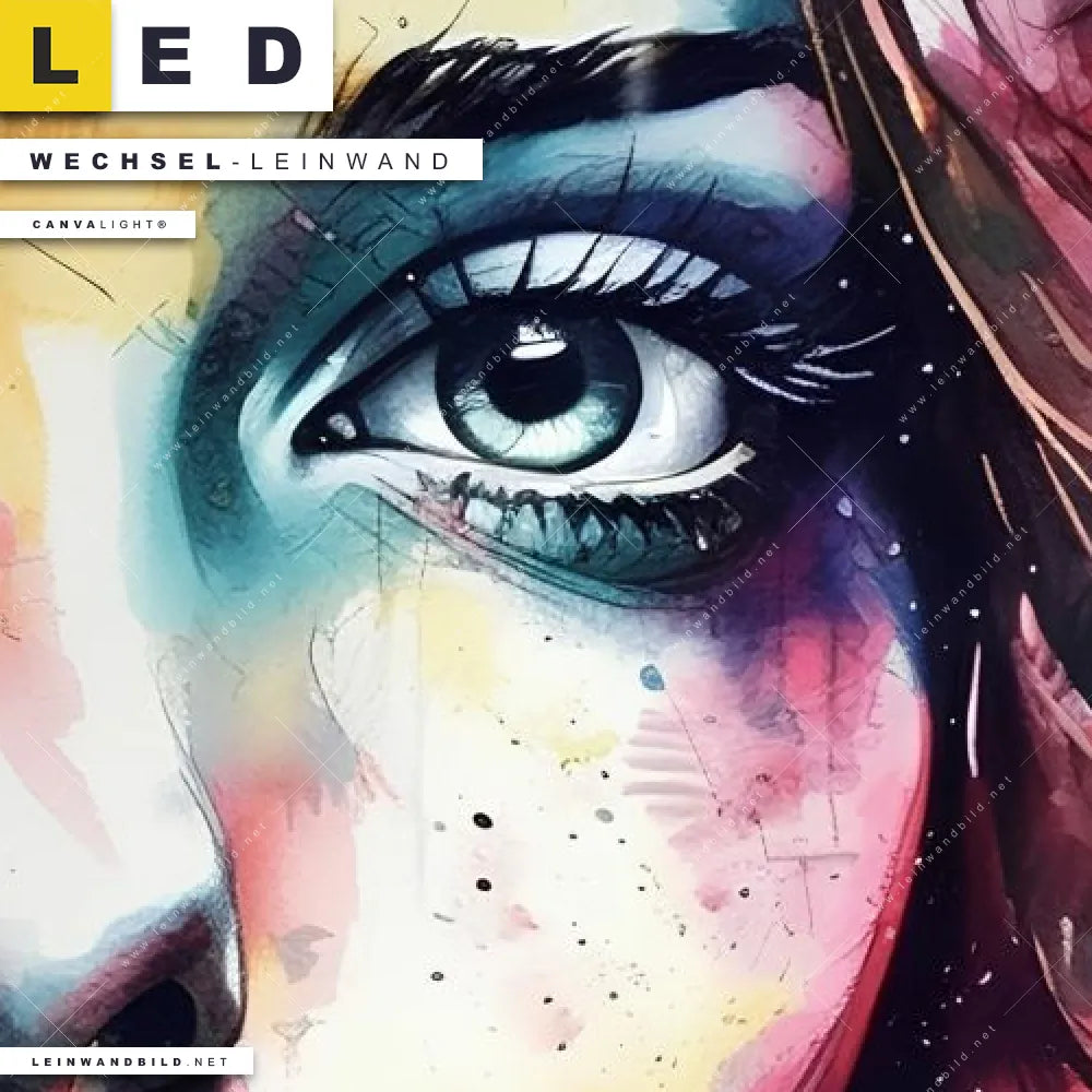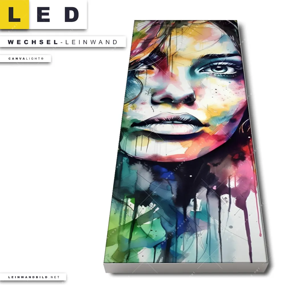 Du bist auf der Suche nach einer Porträts - Menschen Wechsel-Leinwand für Dein LED-Leinwandbild im Schmalen Format? Begriffe wie Frau, Portrait, Gesicht, Mädchen, Dame, Schönheit, Farbe haben Dich auf der Suche nach Deiner Ersatz-Leinwand für dein LED Wandbild im Panorama-Hochformat mit wechselbarer Leinwand inspiriert? Farben wie Bunt dürfen auf Deinem neuen Wechselmotiv für Dein XXL Leinwand-LED-Bild nicht fehlen und Leinwände im Abstrakt, Modern Art Stil für Leuchtbilder passen perfekt zu Deinem Einrichtungsstil?