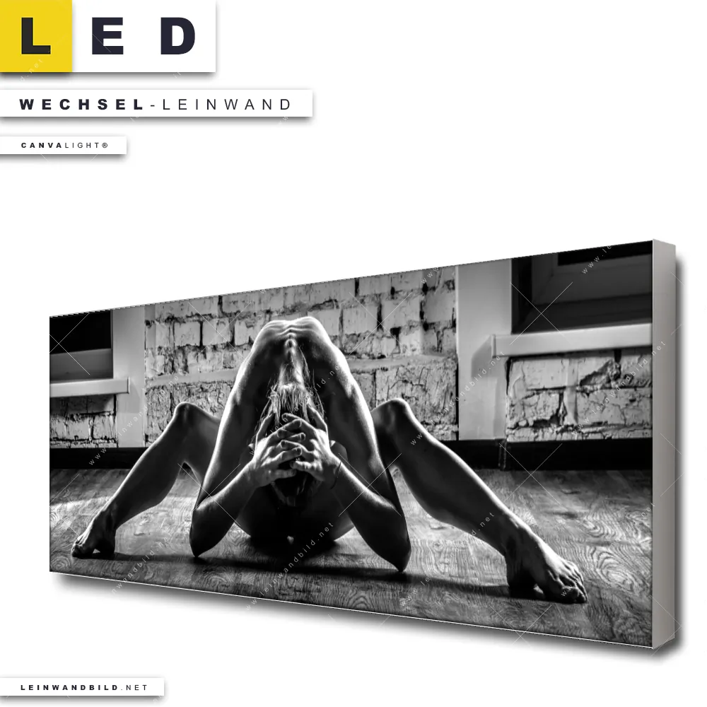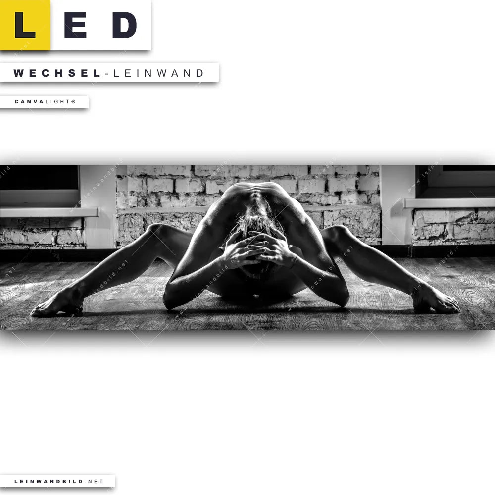 Dann sollte die Wechsel-Leinwand Canvalight® TEX | Schönheit der Frau | Panorama den Weg zu Dir finden. Die Austausch-Leinwand schöne, gelenkige Frau - passend für unsere stufenlos dimmbaren, steckerfertigen Leinwandbilder im LED Leuchtrahmen mit Fernbedienung und optionaler Farbtemperatursteuerung - fügt sich als Eye-Catcher harmonisch in jedes Wohnzimmer - Schlafzimmer Raumkonzept ein.