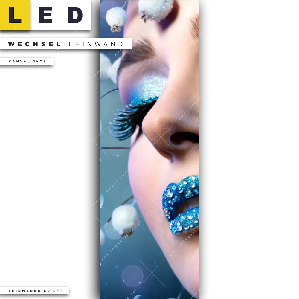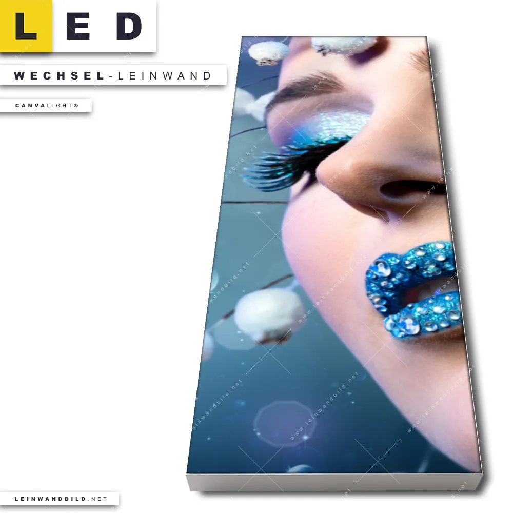 Dann sollte die Wechsel-Leinwand Canvalight® TEX | Schönheit in Blau & Weiss | Schmal den Weg zu Dir finden. Die Austausch-Leinwand Porträt Frau in blauem Farbspiel - passend für unsere stufenlos dimmbaren, steckerfertigen Leinwandbilder im LED Leuchtrahmen mit Fernbedienung und optionaler Farbtemperatursteuerung - fügt sich als Eye-Catcher harmonisch in jedes Friseur - Beauty, Bar - Gastronomie, Flur - Eingangsbereich, Wohnzimmer - Schlafzimmer Raumkonzept ein.