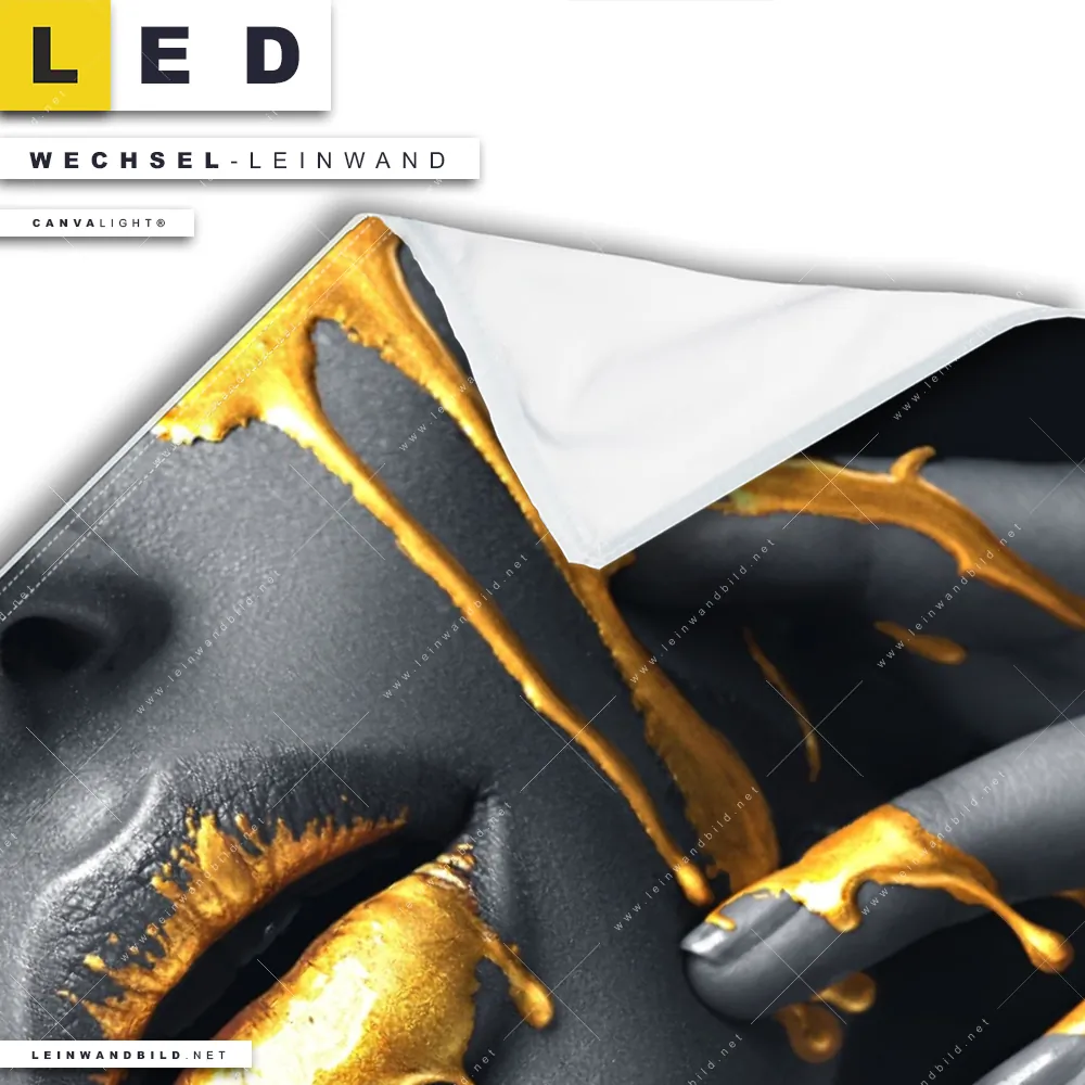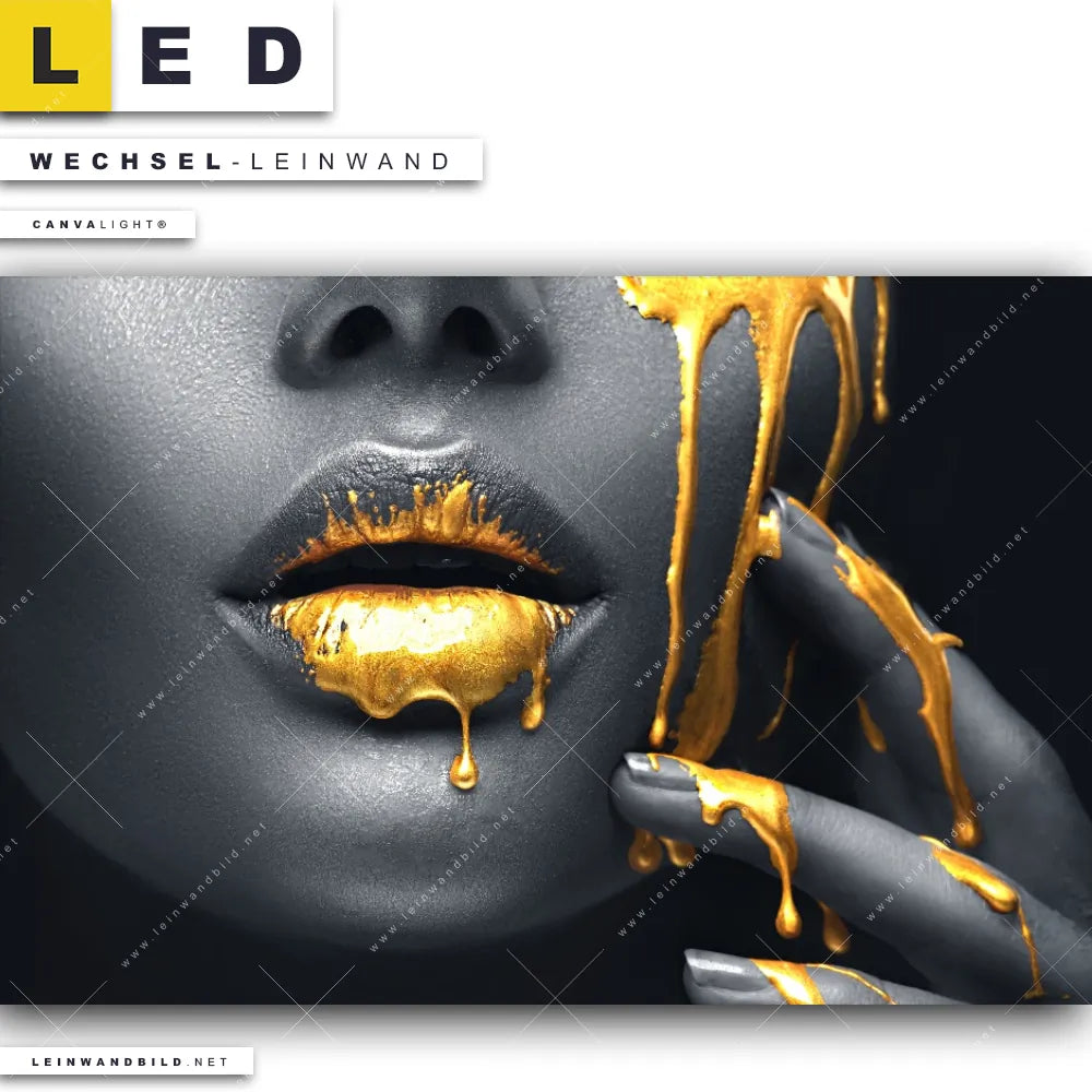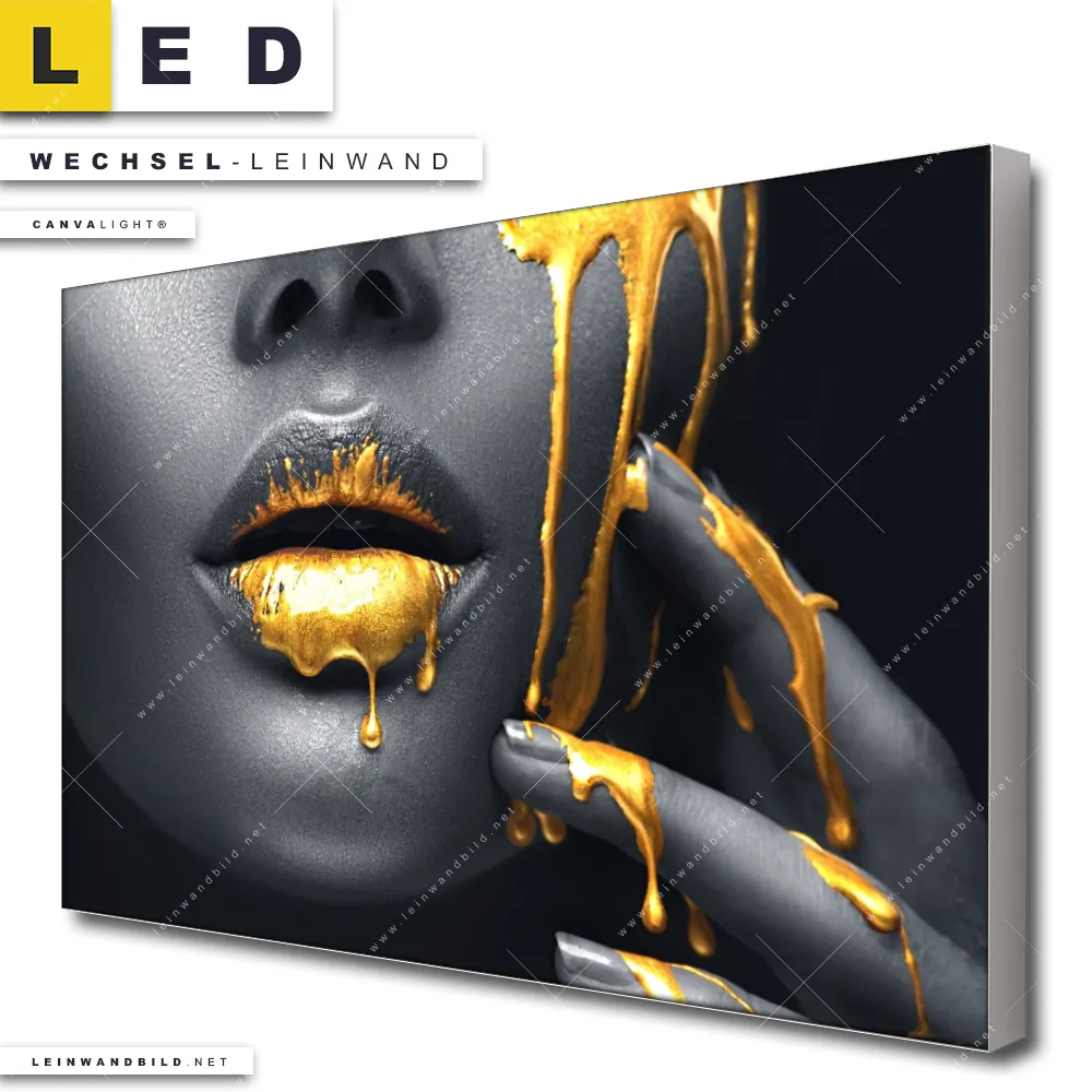 Du bist auf der Suche nach einer Porträts - Menschen Wechsel-Leinwand für Dein LED-Leinwandbild im Querformat? Begriffe wie Frau, Lippen, Mund, Porträt, Erotik, modern, Gold, Silber, Farbe, Beauty haben Dich auf der Suche nach Deiner Ersatz-Leinwand für dein breites LED Wandbild mit wechselbarer Leinwand inspiriert? Farben wie Gold, Silber, Schwarz dürfen auf Deinem neuen Wechselmotiv für Dein XXL Leinwand-LED-Bild nicht fehlen und Leinwände im Modern Art Stil für Leuchtbilder passen perfekt zu Deinem Einrichtungsstil?