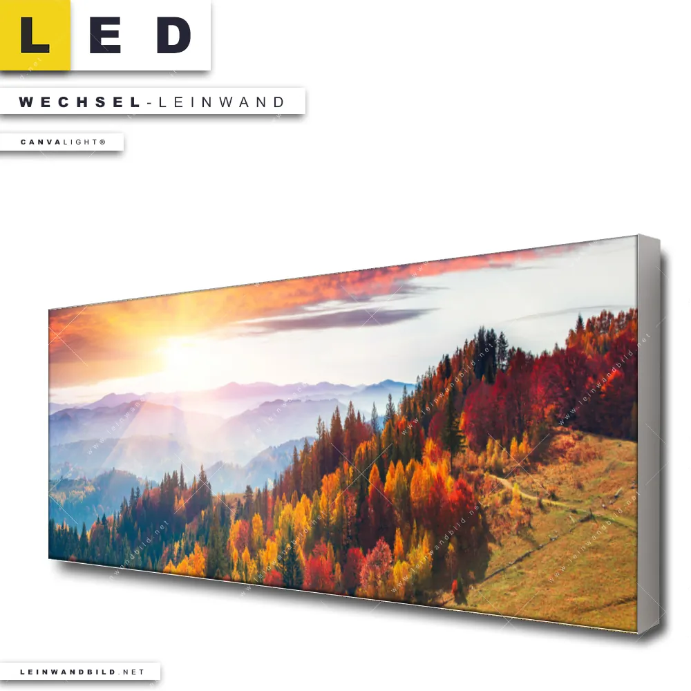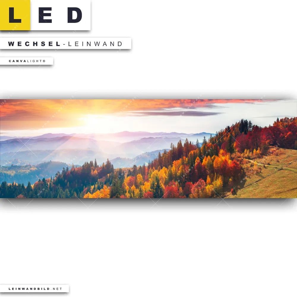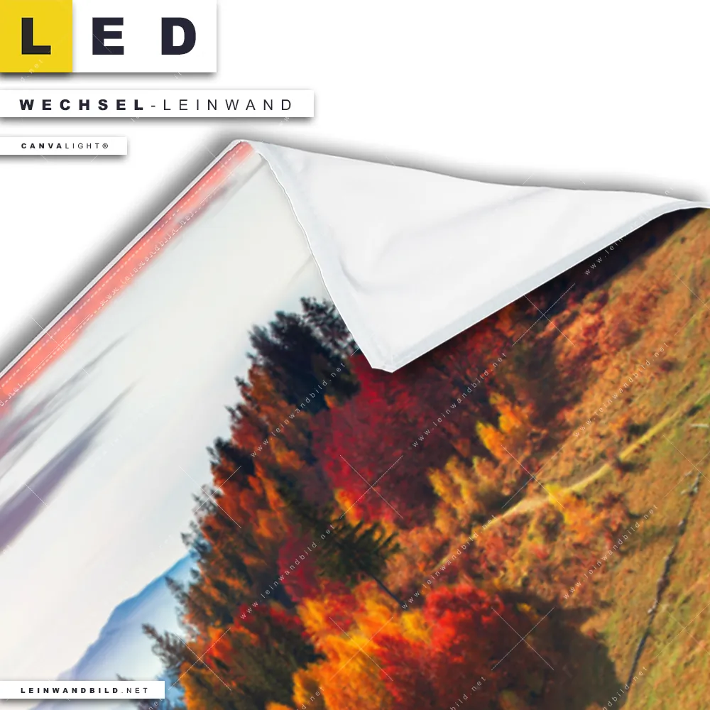 Dann sollte die Wechsel-Leinwand Canvalight® TEX | Schönheitswelt | Panorama den Weg zu Dir finden. Die Austausch-Leinwand Herbstlandschaft - passend für unsere stufenlos dimmbaren, steckerfertigen Leinwandbilder im LED Leuchtrahmen mit Fernbedienung und optionaler Farbtemperatursteuerung - fügt sich als Eye-Catcher harmonisch in jedes Wohnzimmer - Schlafzimmer, Flur - Eingangsbereich, Büro - Kanzlei, Arzt - Praxis Raumkonzept ein.