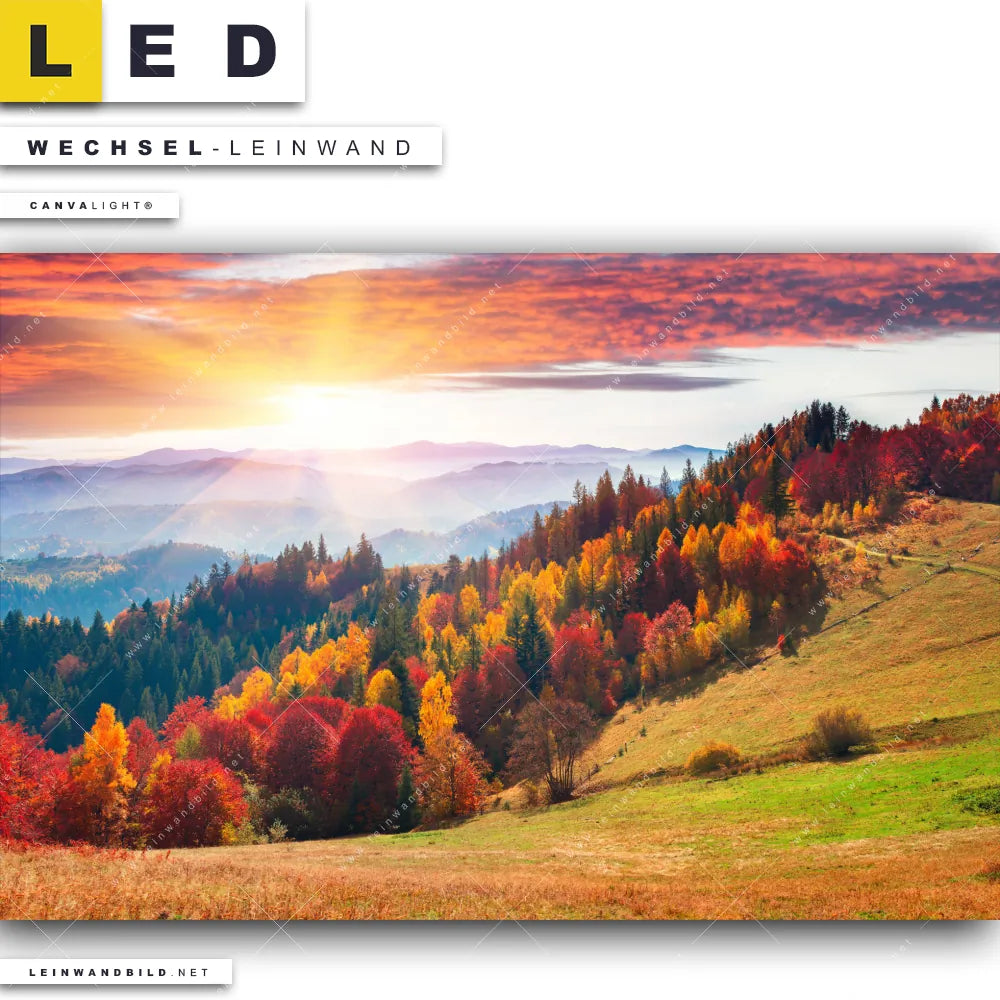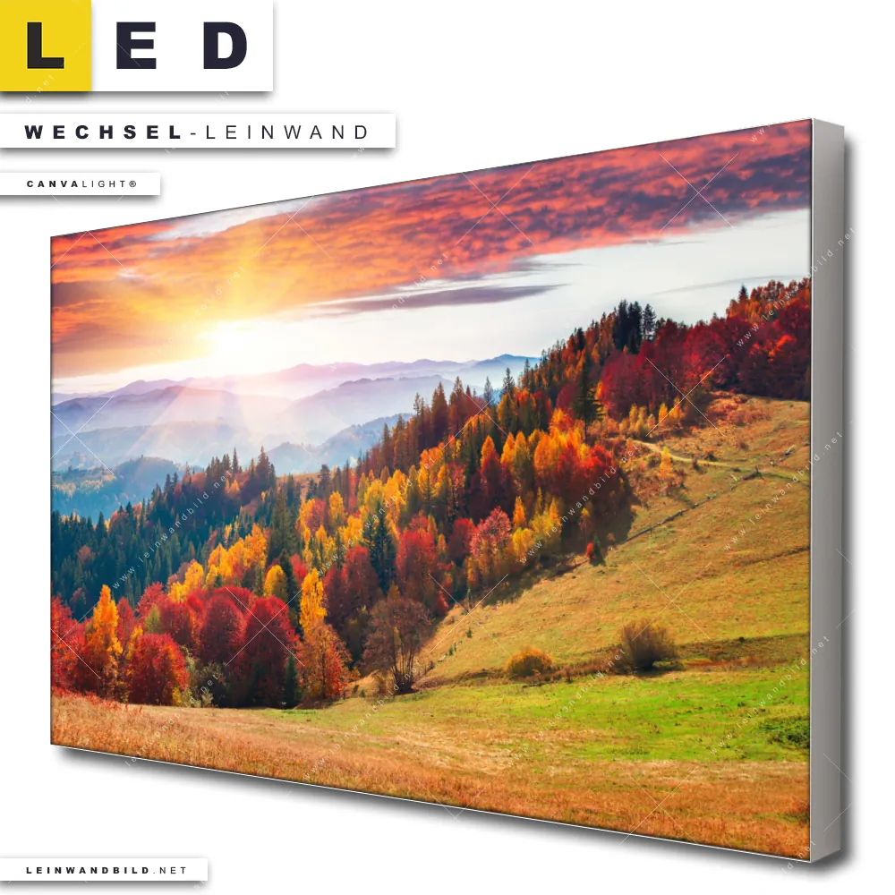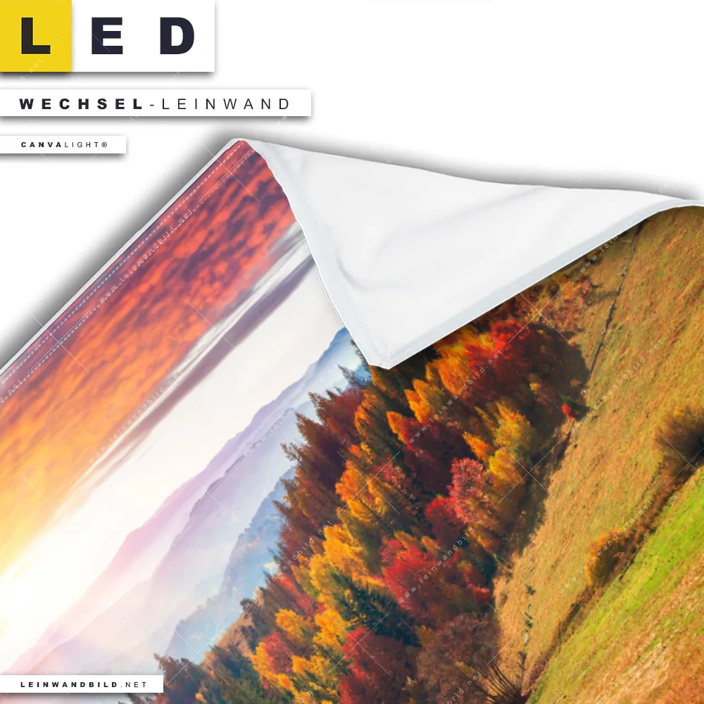Dann sollte die Wechsel-Leinwand Canvalight® TEX | Schönheitswelt | Querformat den Weg zu Dir finden. Die Austausch-Leinwand Sonnenuntergang im Herbst - passend für unsere stufenlos dimmbaren, steckerfertigen Leinwandbilder im Leuchtrahmen mit Fernbedienung und optionaler Farbtemperatursteuerung - fügt sich als Eye-Catcher harmonisch in jedes Wohnzimmer - Schlafzimmer, Flur - Eingangsbereich, Büro - Kanzlei, Arzt - Praxis Raumkonzept ein.