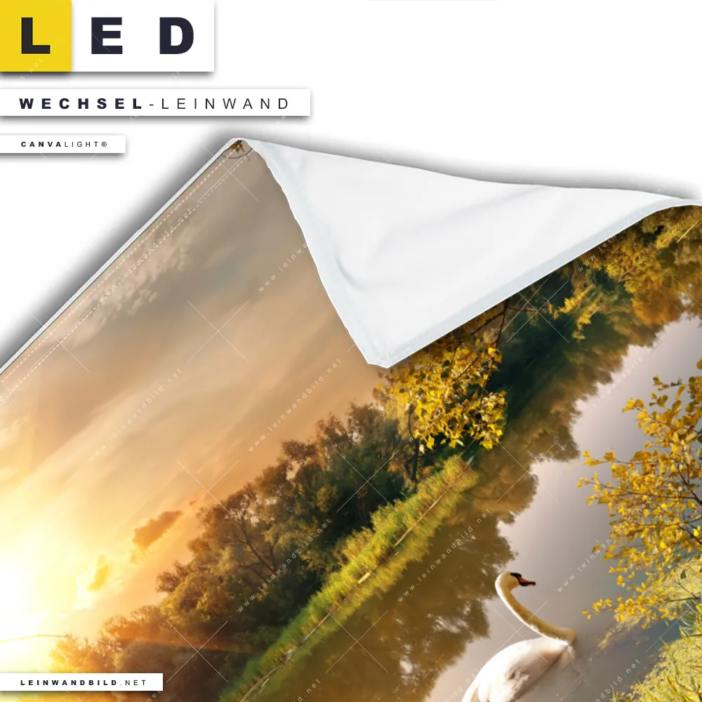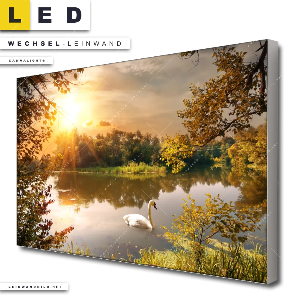 Du bist auf der Suche nach einer Landschaften, Tierwelt Wechsel-Leinwand für Dein LED-Leinwandbild im Querformat? Begriffe wie Sonnenuntergang, Nebel, Morgenstimmung, See, Angeln, Teich, Herbst, Schwan haben Dich auf der Suche nach Deiner Ersatz-Leinwand für dein breites LED Wandbild mit wechselbarer Leinwand inspiriert? Farben wie Braun, Grün, Beige, Orange, Weiss dürfen auf Deinem neuen Wechselmotiv für Dein XXL Leinwand-LED-Bild nicht fehlen und Leinwände im Retro - Vintage Stil für Leuchtbilder passen perfekt zu Deinem Einrichtungsstil?