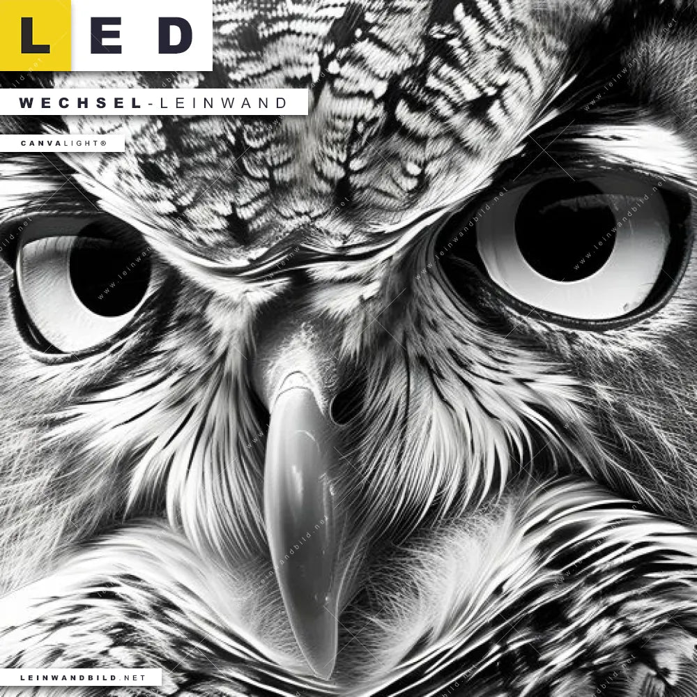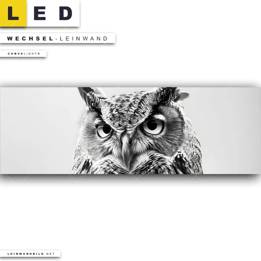 LED Wechsel-Leinwand Canvalight® TEX | Schwarz-Weiß Eulenportrait | Panorama