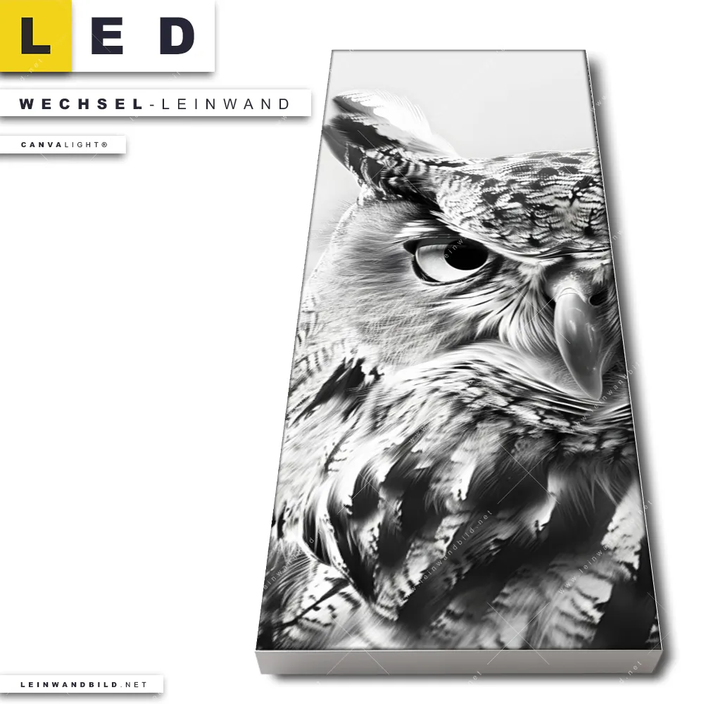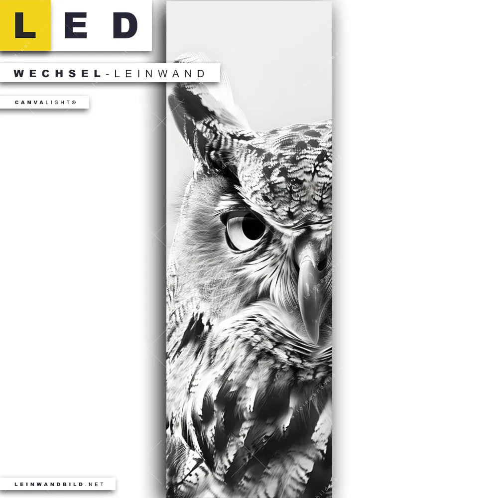 Du bist auf der Suche nach einer Tierwelt Wechsel-Leinwand für Dein LED-Leinwandbild im Schmalen Format? Begriffe wie Tier, Vogel, Eule, Tierporträt, Uhu, Kauz haben Dich auf der Suche nach Deiner Ersatz-Leinwand für dein LED Wandbild im Panorama-Hochformat mit wechselbarer Leinwand inspiriert? Farben wie Weiss, Schwarz, Grau dürfen auf Deinem neuen Wechselmotiv für Dein XXL Leinwand-LED-Bild nicht fehlen und Leinwände im Natürlich - Realistisch, Schwarz - Weiss Stil für Leuchtbilder passen perfekt zu Deinem Einrichtungsstil?