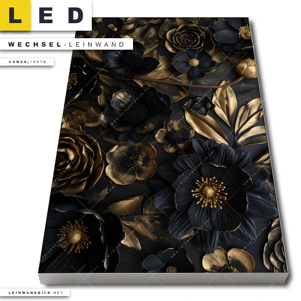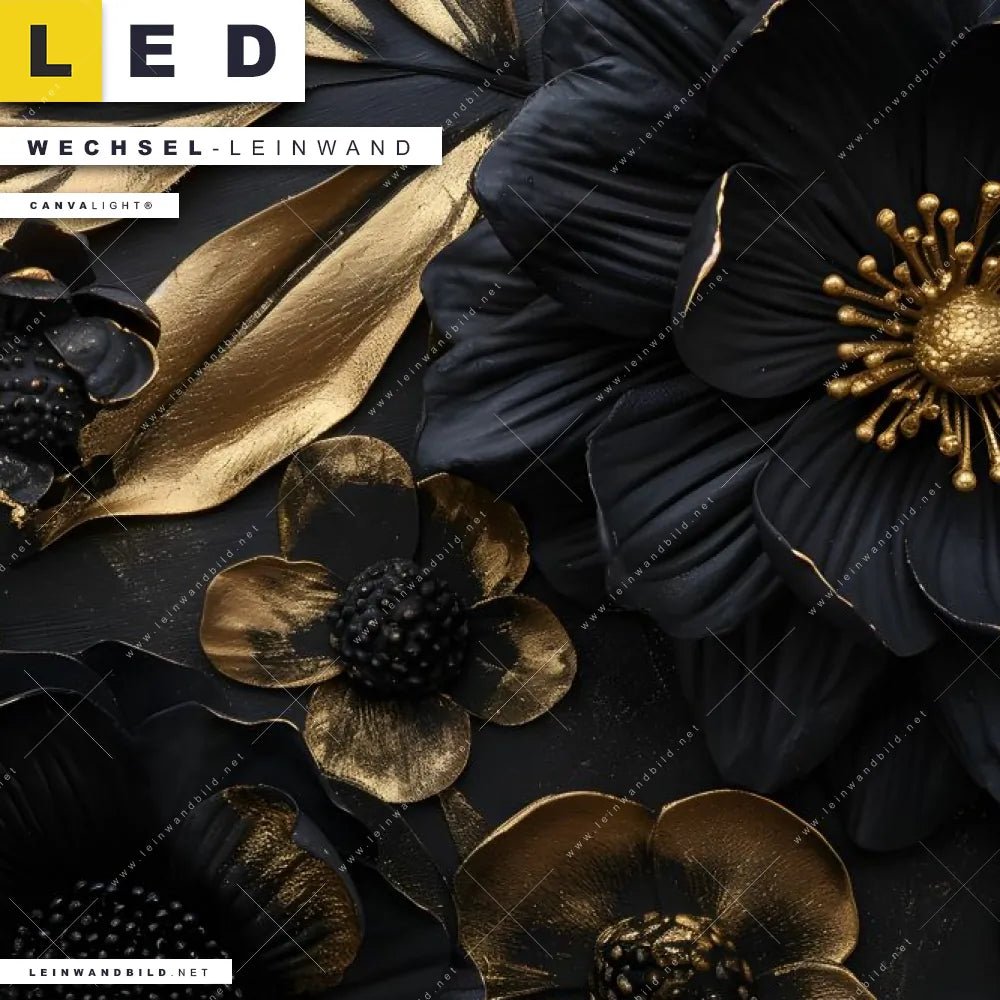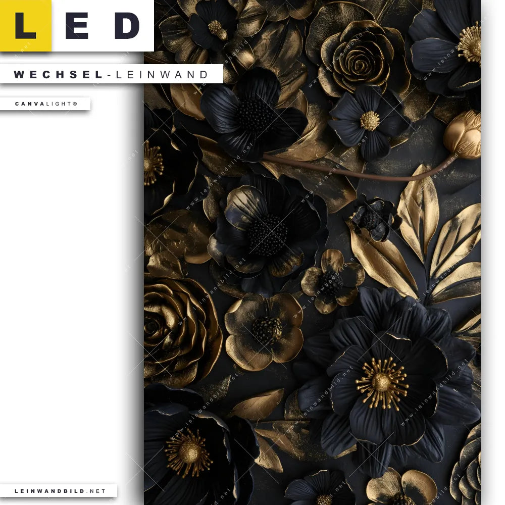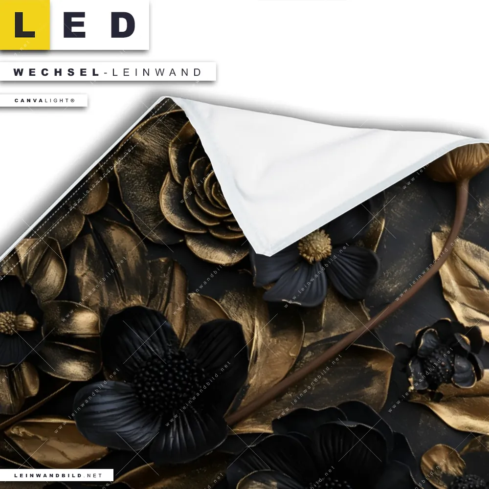 LED Wechsel-Leinwand Canvalight® TEX | Schwarze und goldene Blüten | Hochformat