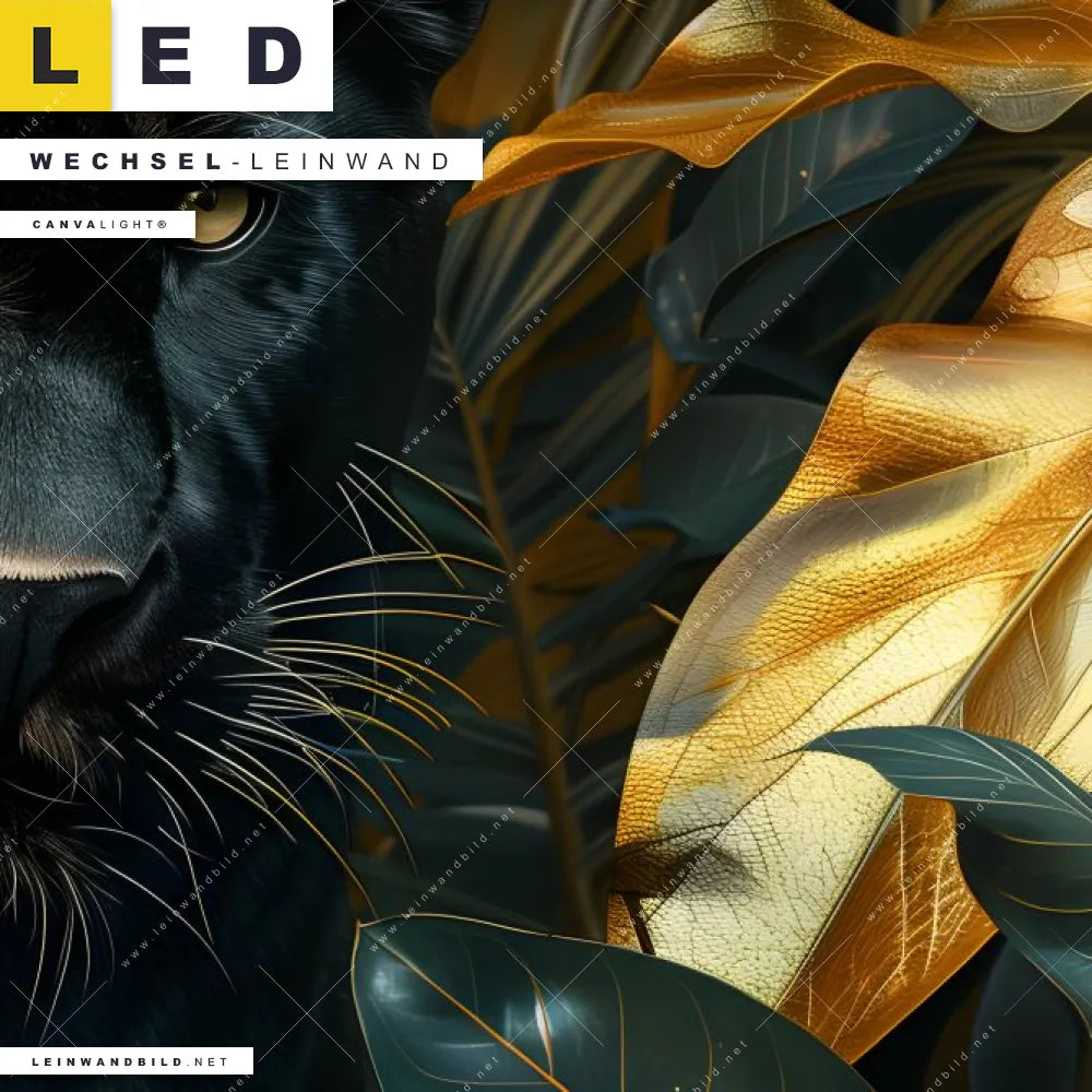 Du bist auf der Suche nach einer Blumen - Botanik, Tierwelt Wechsel-Leinwand für Dein LED-Leinwandbild im Schmalen Format? Begriffe wie Blätter, Pflanze, Natur, Nahaufnahme, Dschungel, Monstera, Palmenblätter, Panther, Raubkatze haben Dich auf der Suche nach Deiner Ersatz-Leinwand für dein LED Wandbild im Panorama-Hochformat mit wechselbarer Leinwand inspiriert? Farben wie Schwarz, Gold dürfen auf Deinem neuen Wechselmotiv für Dein XXL Leinwand-LED-Bild nicht fehlen und Leinwände im Floral, Modern Art Stil für Leuchtbilder passen perfekt zu Deinem Einrichtungsstil?