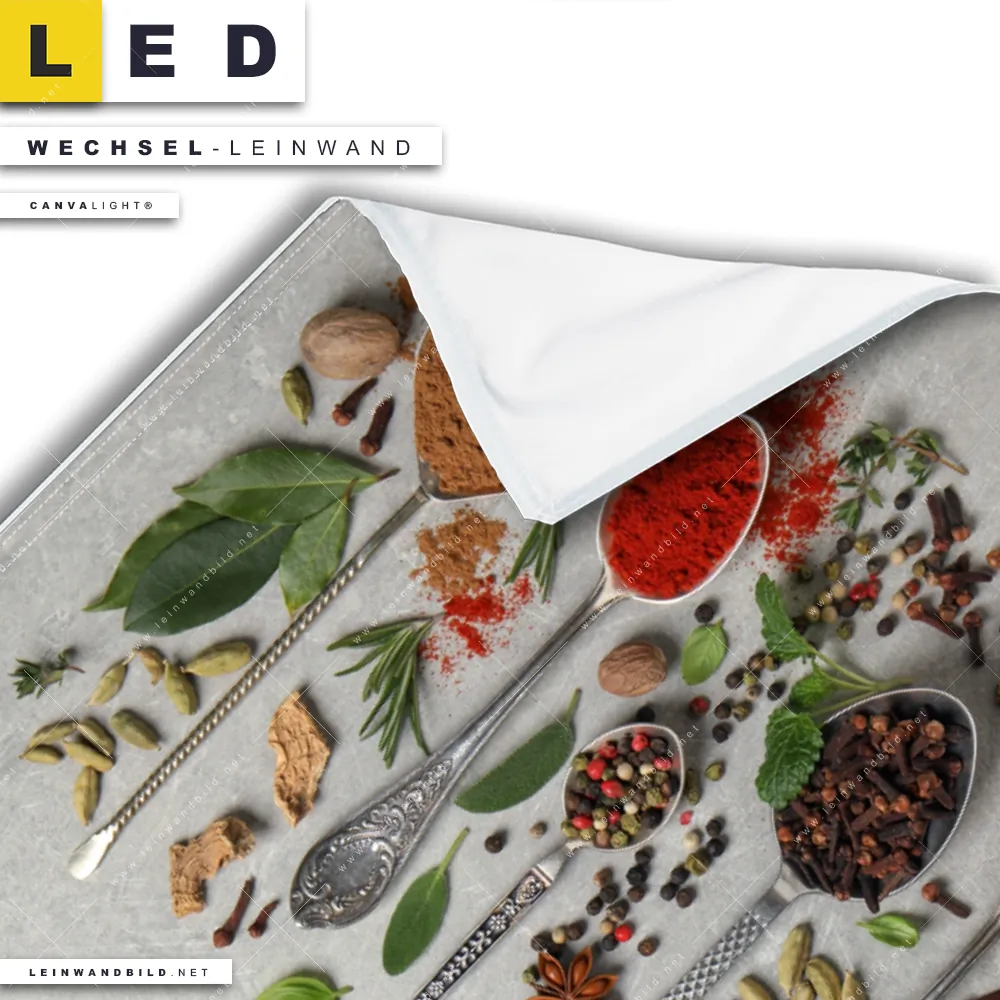 Dann sollte die Wechsel-Leinwand Canvalight® TEX | Silberlöffel mit Gewürzen | Hochformat den Weg zu Dir finden. Die Austausch-Leinwand Frische Gewürze und Kräuter auf Löffeln - passend für unsere stufenlos dimmbaren, steckerfertigen Leinwandbilder im Leuchtrahmen mit Fernbedienung und optionaler Farbtemperatursteuerung - fügt sich als Eye-Catcher harmonisch in jedes Bar - Gastronomie, Küche - Esszimmer Raumkonzept ein.