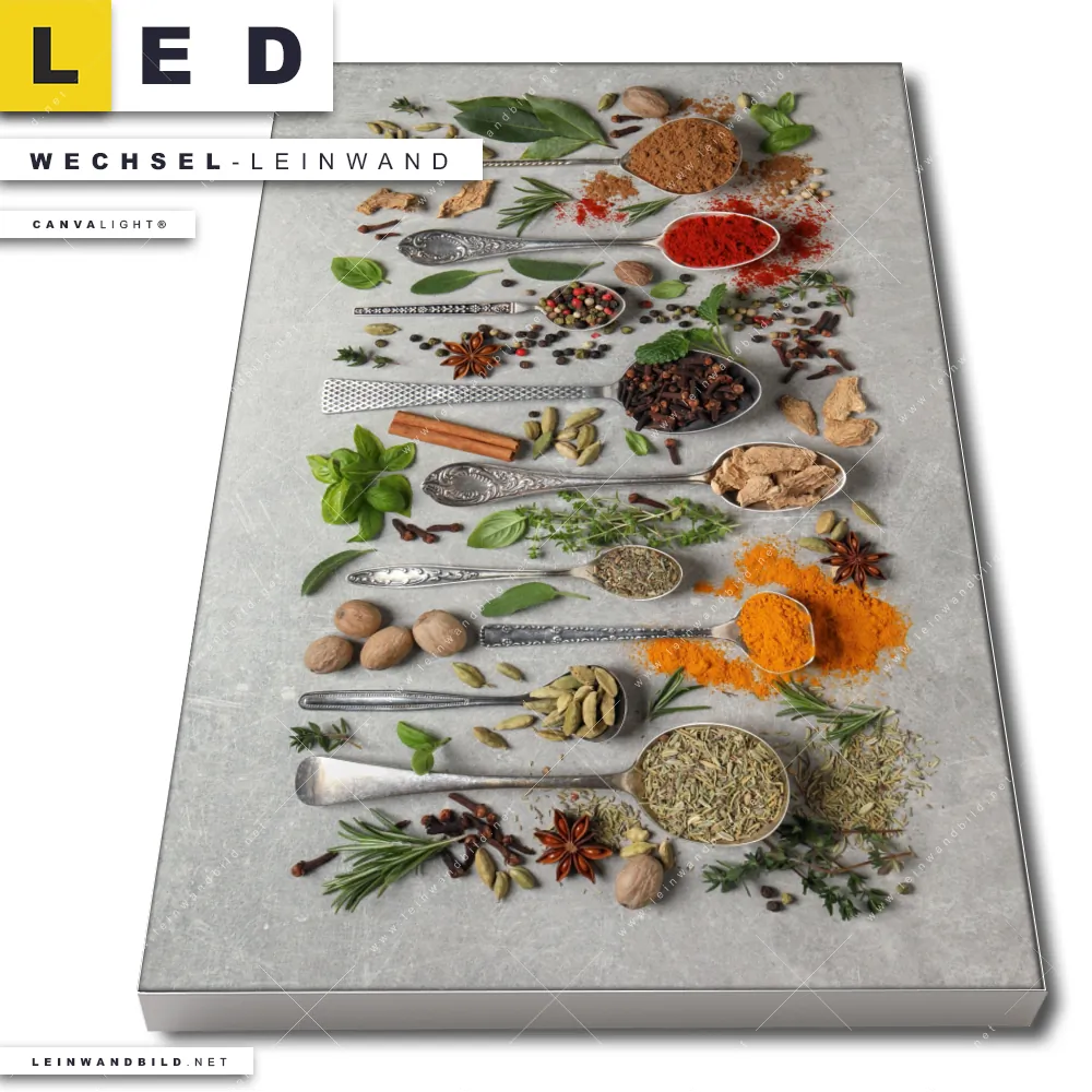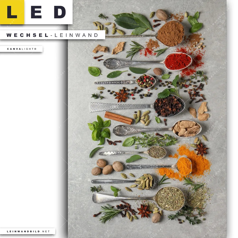Du bist auf der Suche nach einer Essen - Trinken Wechsel-Leinwand für Dein LED-Leinwandbild im Hochformat? Begriffe wie Gewürze, Kräuter, Löffel, kochen, Silberlöffel, Lebensmittel, frisch, lecker, gesund haben Dich auf der Suche nach Deiner Ersatz-Leinwand für dein LED Wandbild mit wechselbarer Leinwand inspiriert? Farben wie Bunt, Schwarz dürfen auf Deinem neuen Wechselmotiv für Dein XXL Leinwand-LED-Bild nicht fehlen und Leinwände im Modern Art, Natürlich - Realistisch Stil für Leuchtbilder passen perfekt zu Deinem Einrichtungsstil?