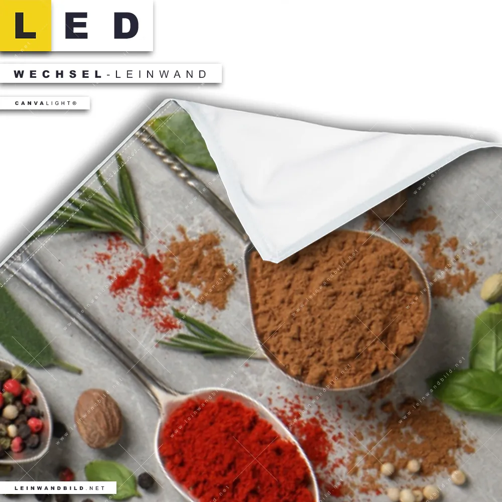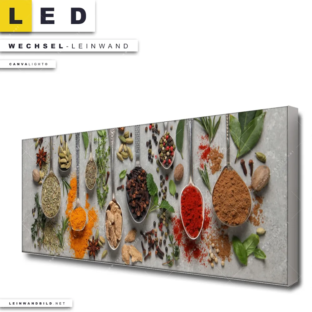 Du bist auf der Suche nach einer Essen - Trinken Wechsel-Leinwand für Dein LED-Leinwandbild im Panorama-Format? Begriffe wie Gewürze, Kräuter, Löffel, kochen, Silberlöffel, Lebensmittel, frisch, lecker, gesund haben Dich auf der Suche nach Deiner Ersatz-Leinwand für dein extra breites LED Wandbild mit wechselbarer Leinwand inspiriert? Farben wie Bunt, Schwarz dürfen auf Deinem neuen Wechselmotiv für Dein XXL Leinwand-LED-Bild nicht fehlen und Leinwände im Modern Art, Natürlich - Realistisch Stil für Leuchtbilder passen perfekt zu Deinem Einrichtungsstil?