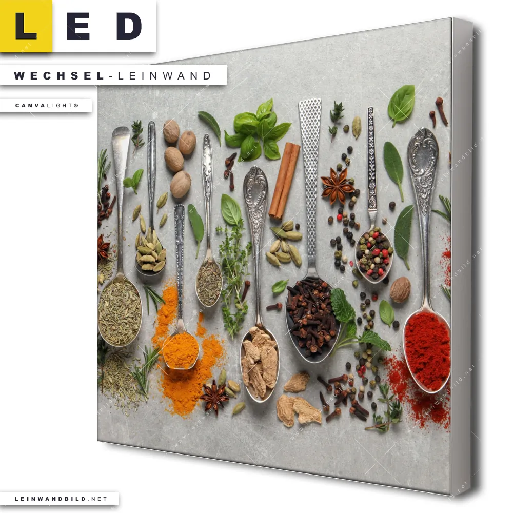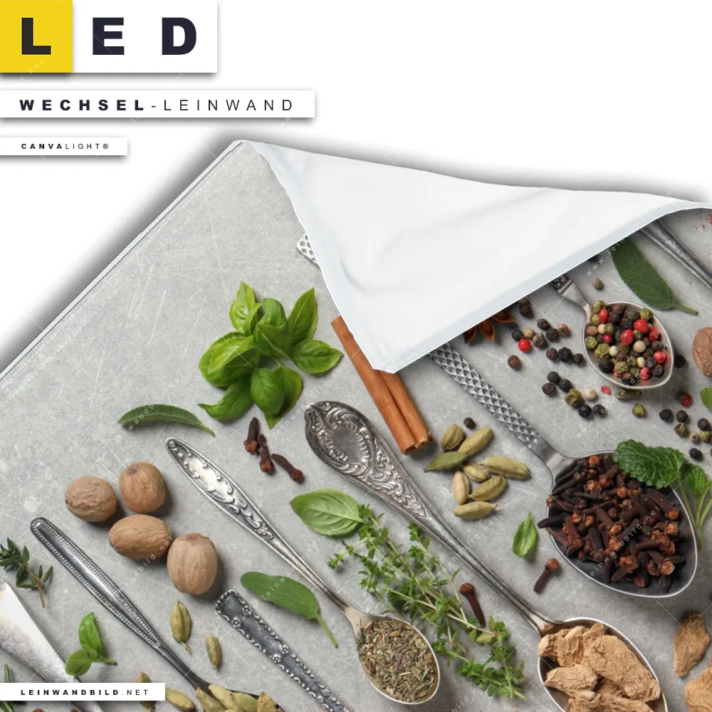 Du bist auf der Suche nach einer Essen - Trinken Wechsel-Leinwand für Dein LED-Leinwandbild im Quadratischen Format? Begriffe wie Gewürze, Kräuter, Löffel, kochen, Silberlöffel, Lebensmittel, frisch, lecker, gesund haben Dich auf der Suche nach Deiner Ersatz-Leinwand für dein LED Wandbild mit wechselbarer Leinwand inspiriert? Farben wie Bunt, Schwarz dürfen auf Deinem neuen Wechselmotiv für Dein XXL Leinwand-LED-Bild nicht fehlen und Leinwände im Modern Art, Natürlich - Realistisch Stil für Leuchtbilder passen perfekt zu Deinem Einrichtungsstil?