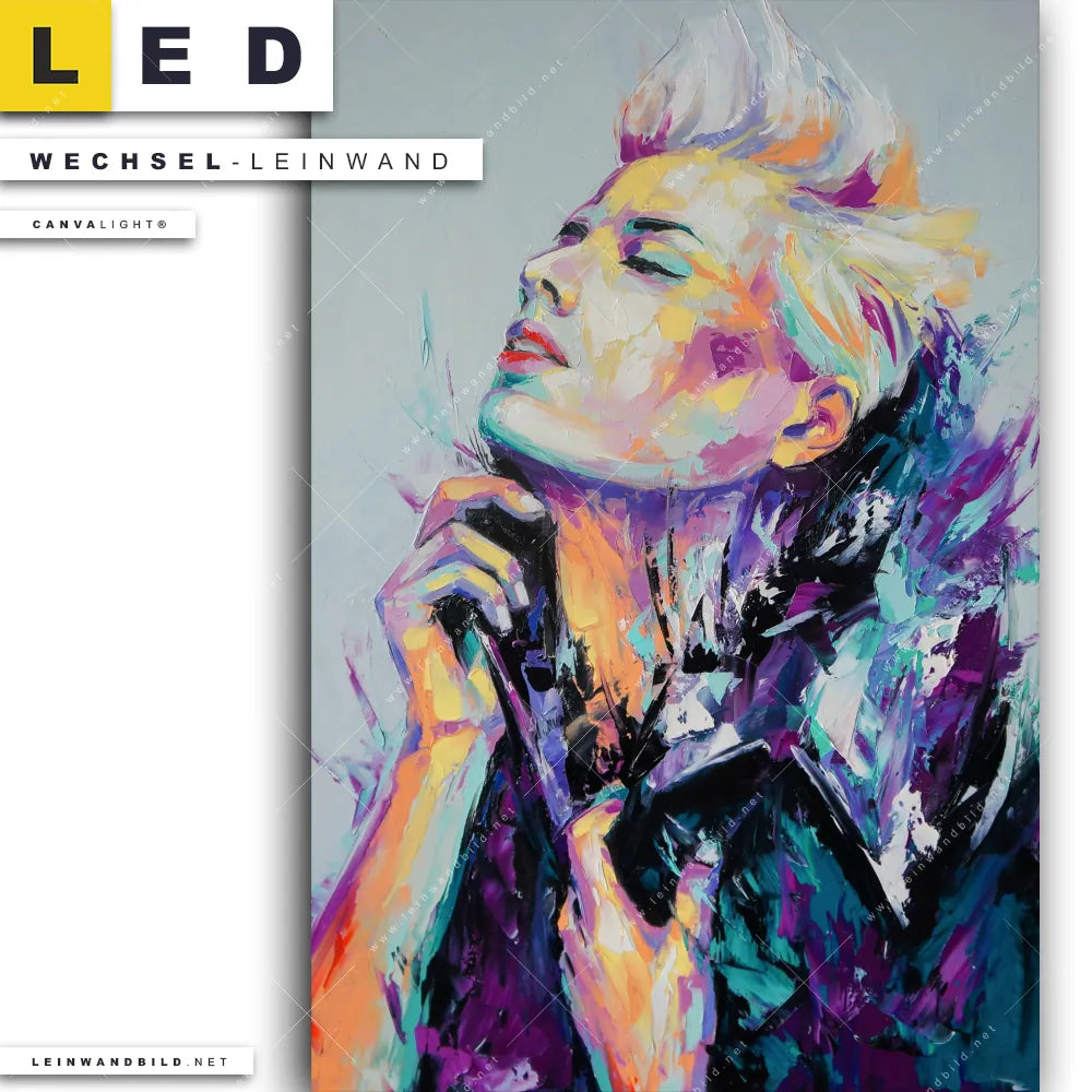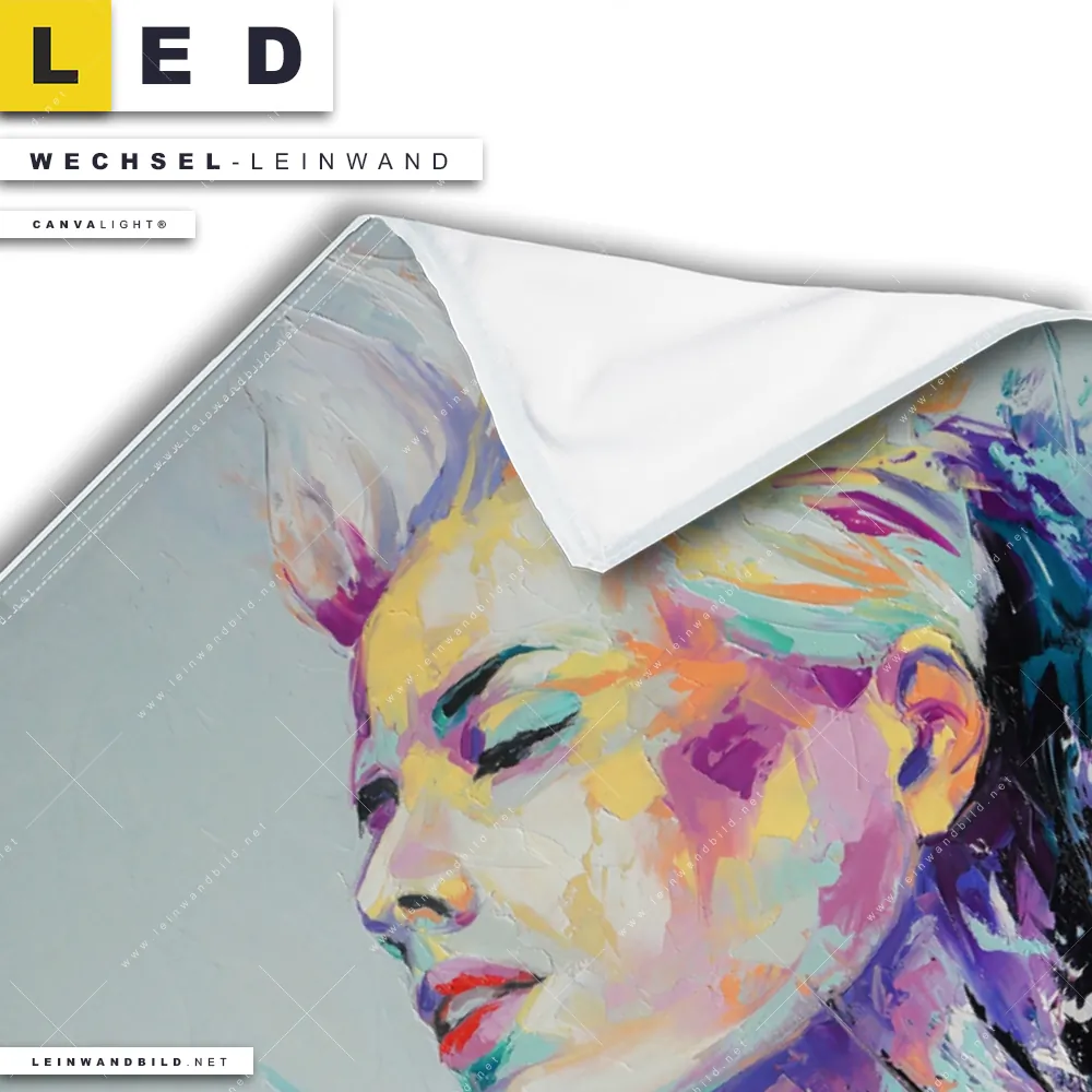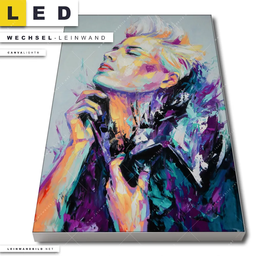 Du bist auf der Suche nach einer Porträts - Menschen Wechsel-Leinwand für Dein LED-Leinwandbild im Hochformat? Begriffe wie Abstrakt, Modern, Kunst, Gemälde, Ölfarbe, Leinwand, Frau, Portrait, Gesicht haben Dich auf der Suche nach Deiner Ersatz-Leinwand für dein LED Wandbild mit wechselbarer Leinwand inspiriert? Farben wie Türkis, Lila, Hellblau, Weiss dürfen auf Deinem neuen Wechselmotiv für Dein XXL Leinwand-LED-Bild nicht fehlen und Leinwände im Abstrakt, Modern Art Stil für Leuchtbilder passen perfekt zu Deinem Einrichtungsstil?