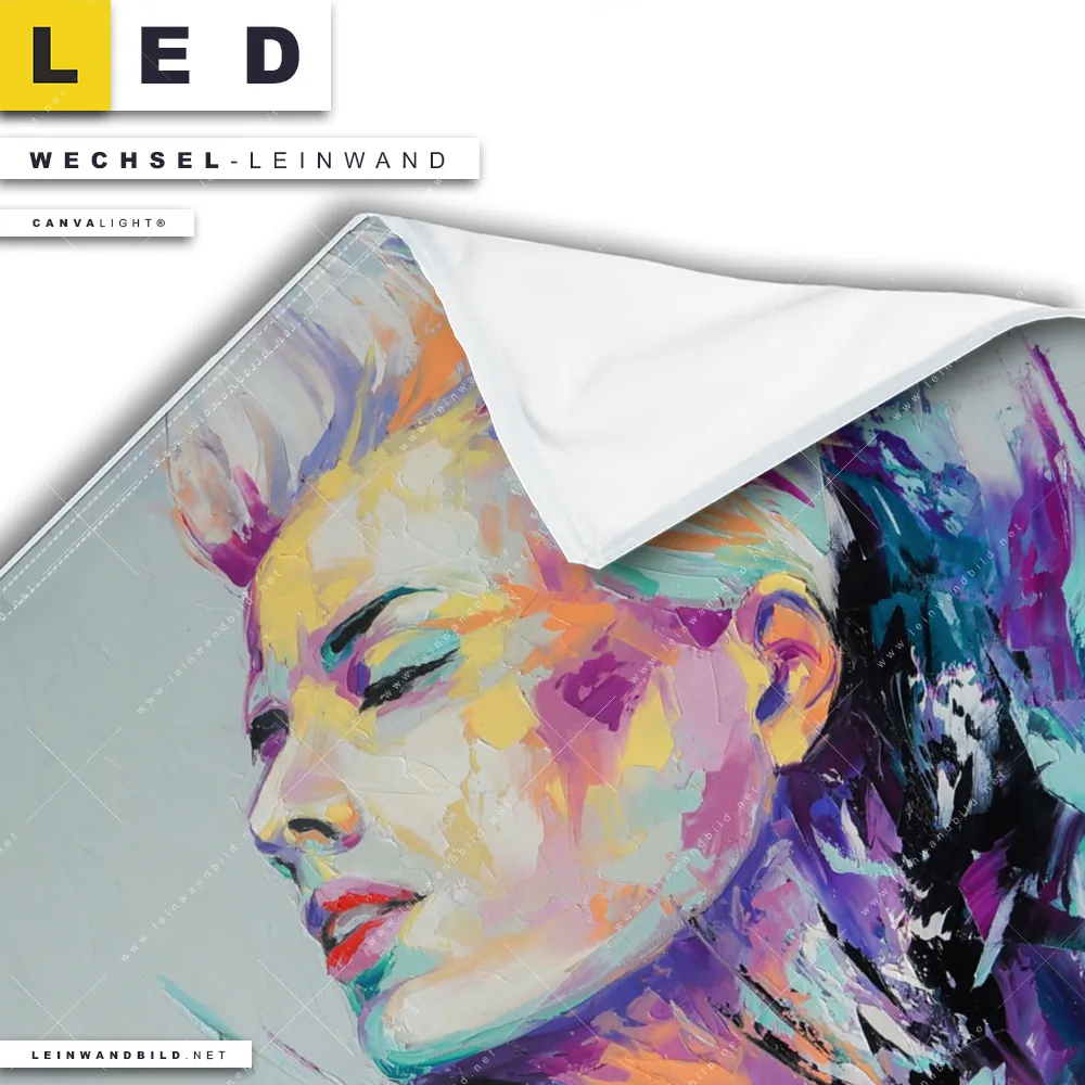 Du bist auf der Suche nach einer Porträts - Menschen Wechsel-Leinwand für Dein LED-Leinwandbild im Quadratischen Format? Begriffe wie Abstrakt, Modern, Kunst, Gemälde, Ölfarbe, Leinwand, Frau, Portrait, Gesicht haben Dich auf der Suche nach Deiner Ersatz-Leinwand für dein LED Wandbild mit wechselbarer Leinwand inspiriert? Farben wie Türkis, Lila, Hellblau, Weiss dürfen auf Deinem neuen Wechselmotiv für Dein XXL Leinwand-LED-Bild nicht fehlen und Leinwände im Abstrakt, Modern Art Stil für Leuchtbilder passen perfekt zu Deinem Einrichtungsstil?
