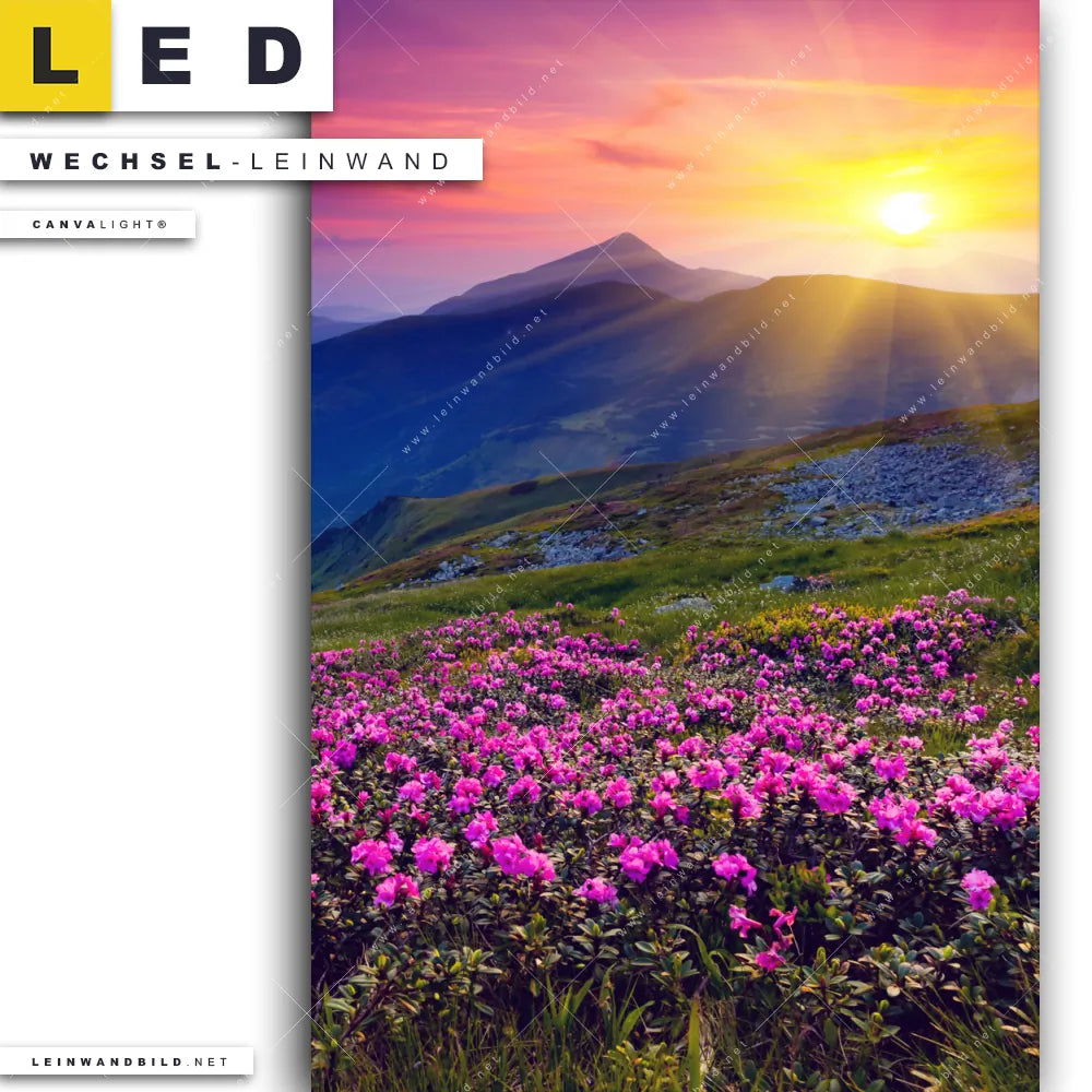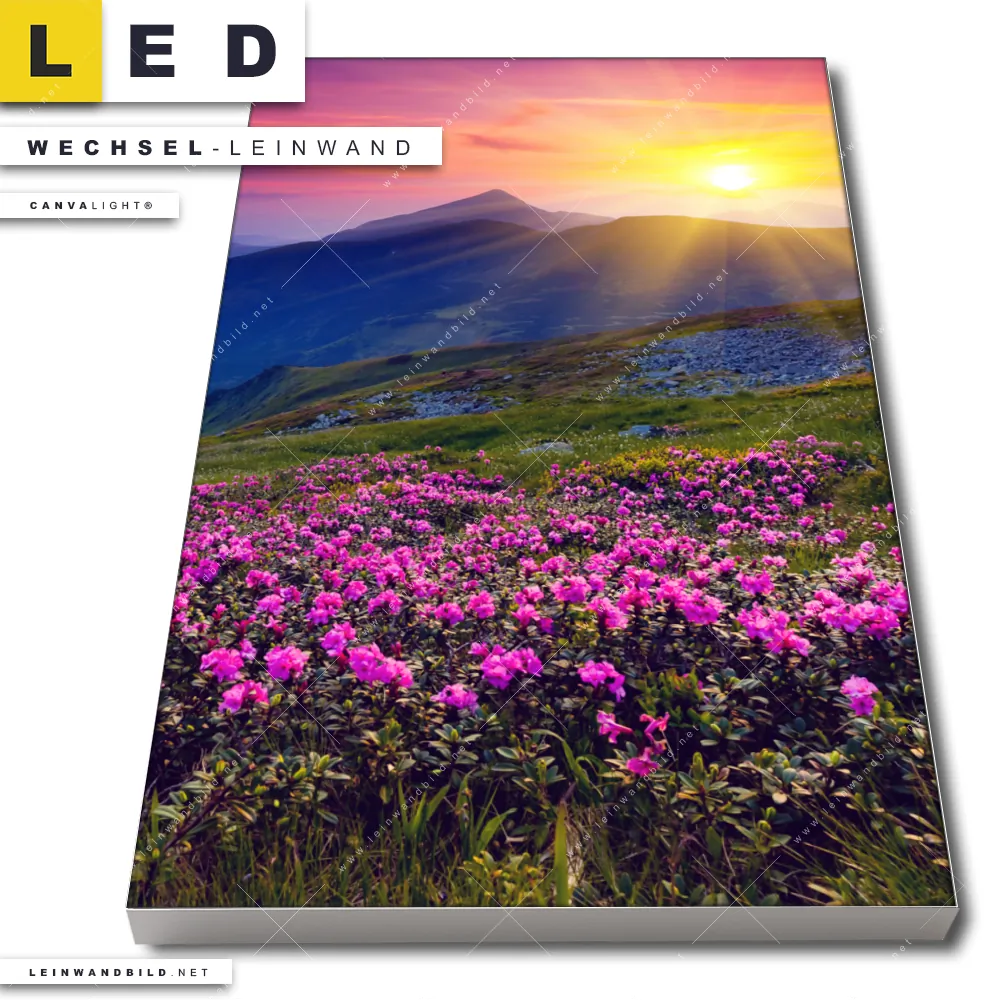 Du bist auf der Suche nach einer Landschaften Wechsel-Leinwand für Dein LED-Leinwandbild im Hochformat? Begriffe wie Berge, Sonnenuntergang, Bergwiese, Sommer, Blumen, Blumenwiese haben Dich auf der Suche nach Deiner Ersatz-Leinwand für dein LED Wandbild mit wechselbarer Leinwand inspiriert? Farben wie Blau, Bunt, Grün, Hellblau, Hellgrün, Lila, Orange, Pink, Rot, Rosa dürfen auf Deinem neuen Wechselmotiv für Dein XXL Leinwand-LED-Bild nicht fehlen und Leinwände im Natürlich - Realistisch Stil für Leuchtbilder passen perfekt zu Deinem Einrichtungsstil?