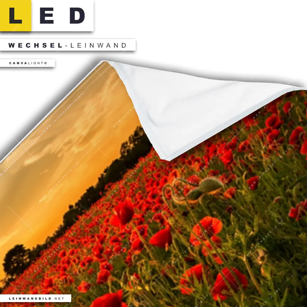 Bitte beachte, dass die Farben, der auf dem Monitor abgebildeten Magischer Abend im Mohnfeld Darstellung, möglicherweise von den Originalfarben deiner Canvalight® TEX Wechsel-Leinwand abweichen können.