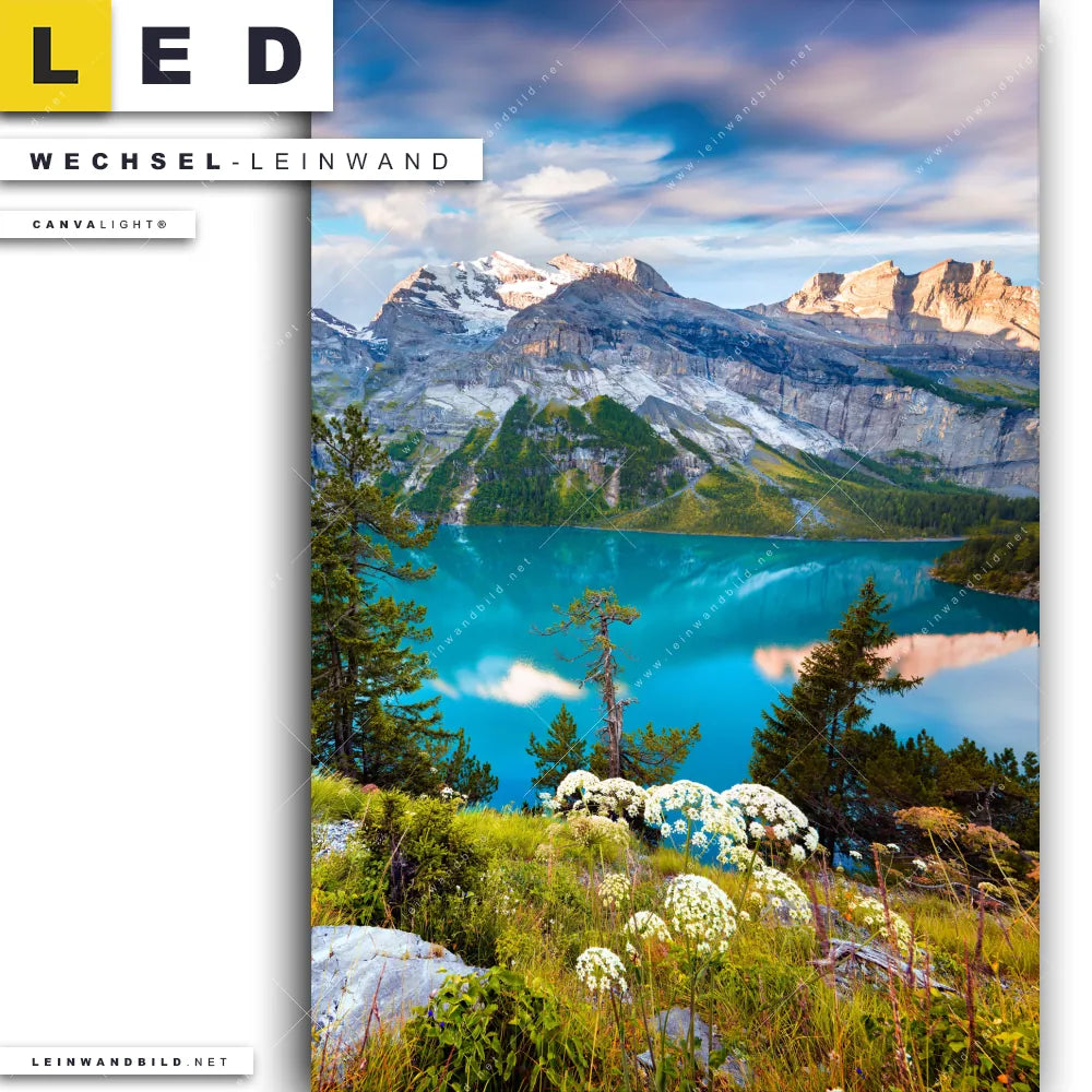 LED Wechsel-Leinwand Canvalight® TEX | Sommermorgen am Bergsee | Hochformat