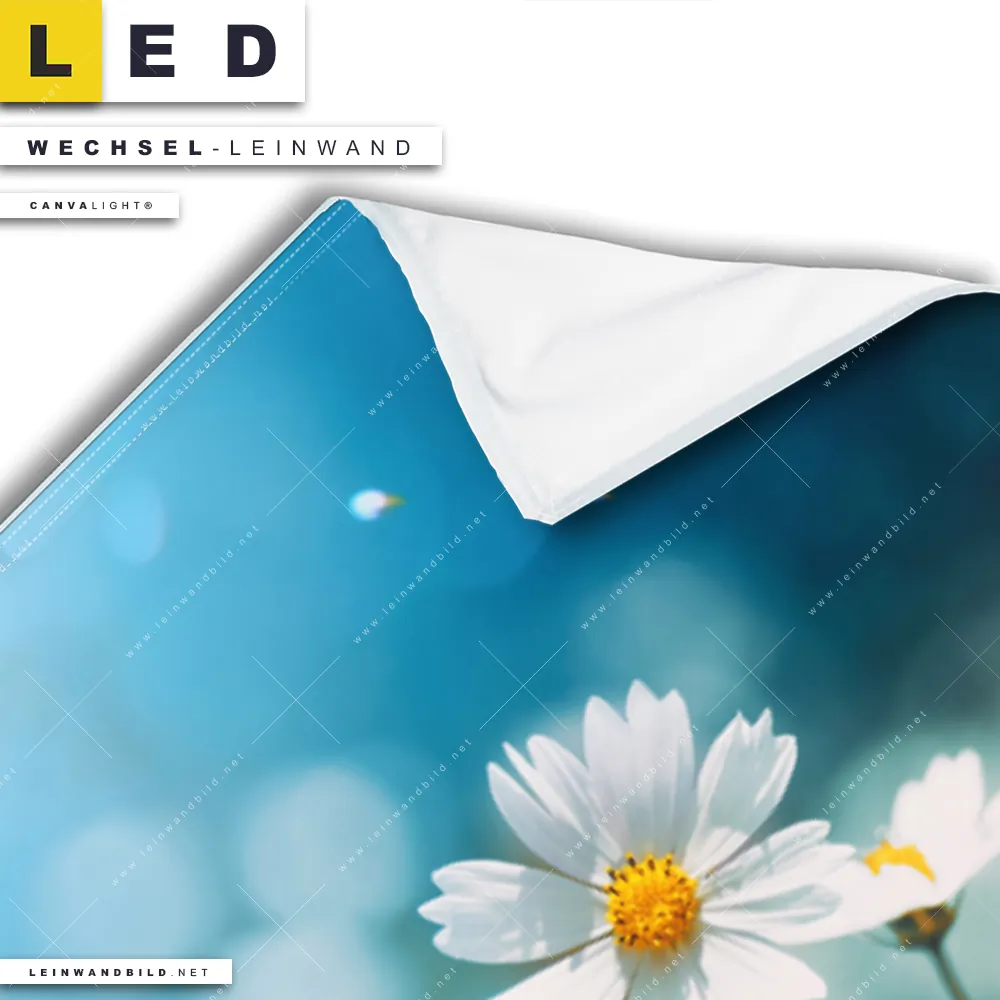 Bitte beachte, dass die Farben, der auf dem Monitor abgebildeten Margeriten mit Schmetterlingen Darstellung, möglicherweise von den Originalfarben deiner Canvalight® TEX Wechsel-Leinwand abweichen können.