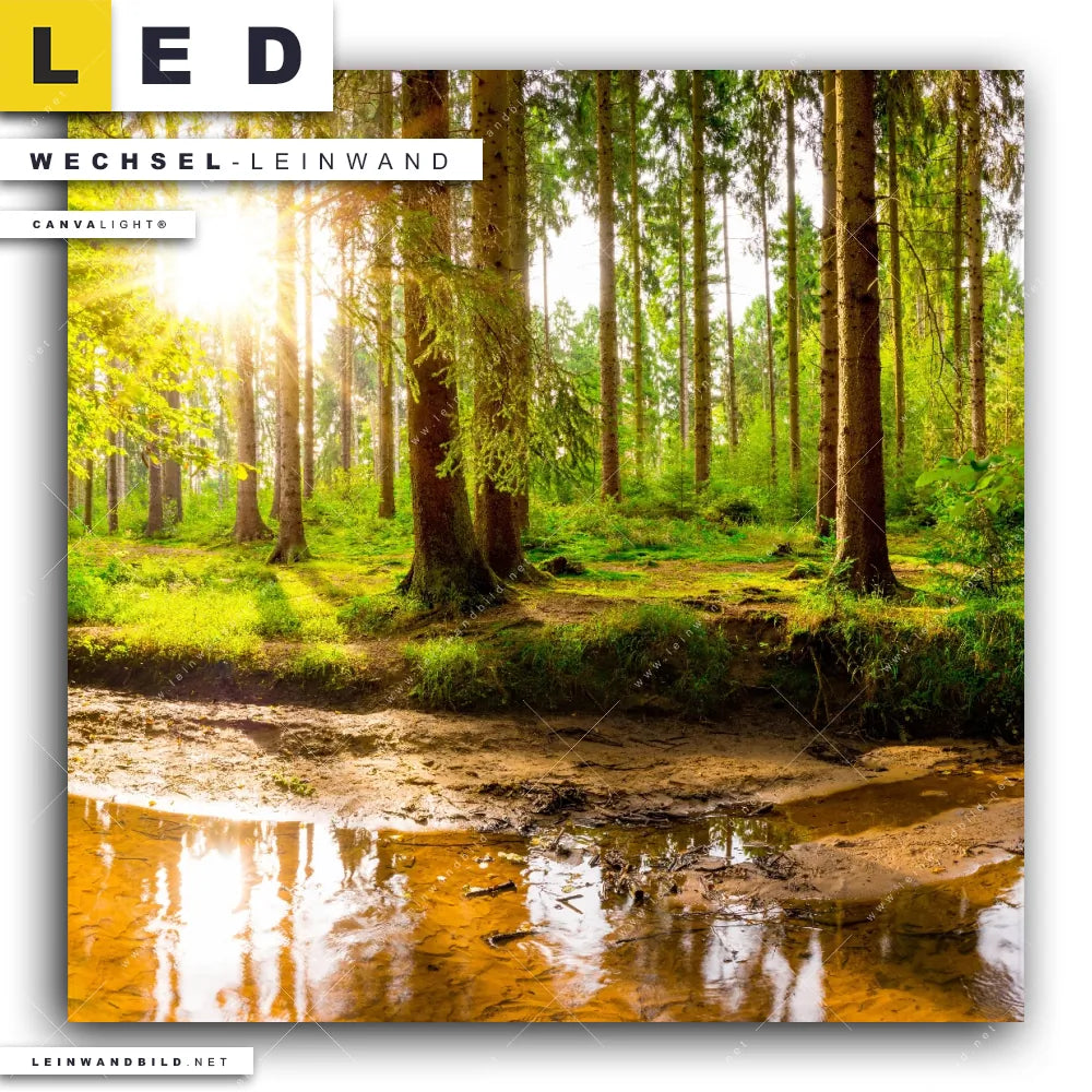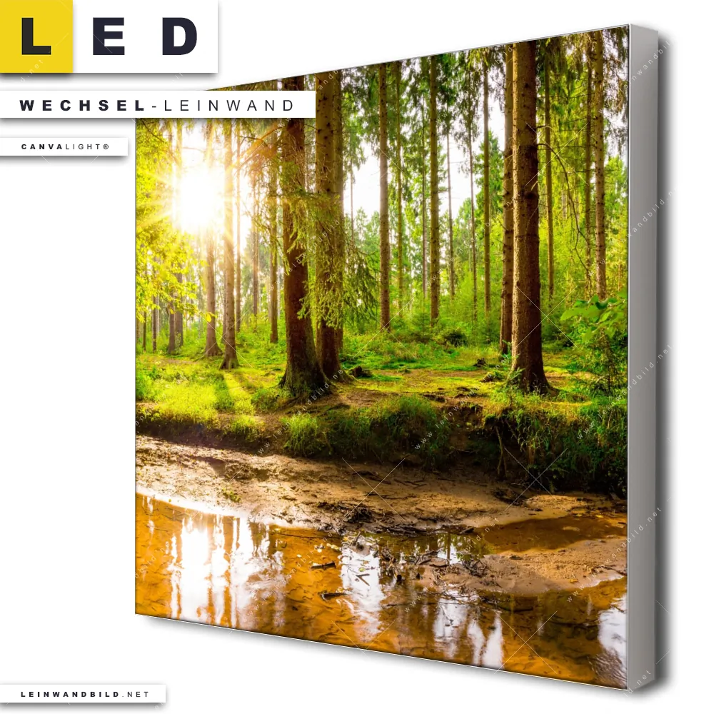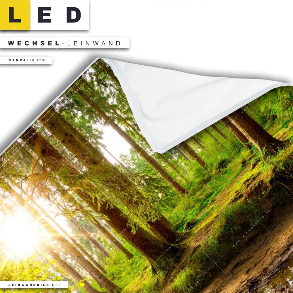 LED Wechsel-Leinwand Canvalight® TEX | Sonne im grünen Wald | Quadrat