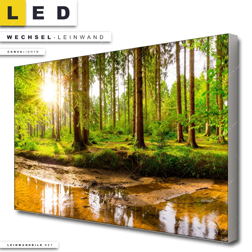 Du bist auf der Suche nach einer Landschaften, Wald - Bäume Wechsel-Leinwand für Dein LED-Leinwandbild im Querformat? Begriffe wie Wald, Landschaft, Baum, Bäume, Natur, Sonne, Sonnenstrahlen, Licht, Fluss, Sonnenlicht, Nadelwald, Laubwald, Eiche, Buche, Bach haben Dich auf der Suche nach Deiner Ersatz-Leinwand für dein breites LED Wandbild mit wechselbarer Leinwand inspiriert? Farben wie Grün, Braun, Hellgrün dürfen auf Deinem neuen Wechselmotiv für Dein XXL Leinwand-LED-Bild nicht fehlen und Leinwände im Natürlich - Realistisch Stil für Leuchtbilder passen perfekt zu Deinem Einrichtungsstil?