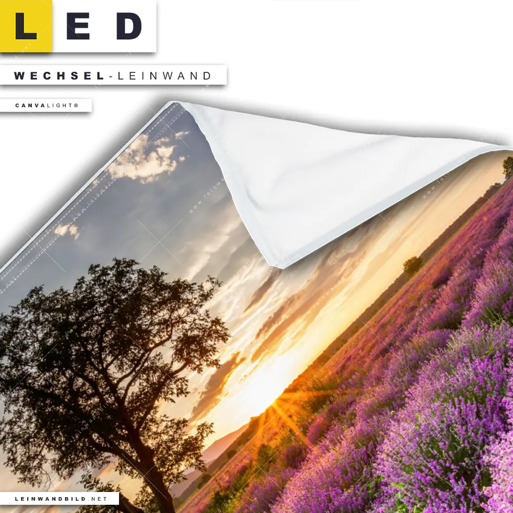 Du konfigurierst Deine individuelle LED Wechsel-Leinwand Canvalight® TEX | Sonnenaufgang im Lavendelfeld | Quadrat und wir produzieren sie NEU für Dich. Unsere Landschaften Austausch-Fotoleinwände für Canvalight® LED Bilder sind KEINE Lagerware. Du bist Dir unsicher, welches Motiv oder Format das richtige für dein individuelles LED Wechselmotiv auf Leinwand ist, dann helfen wir dir gerne weiter und beraten dich!
