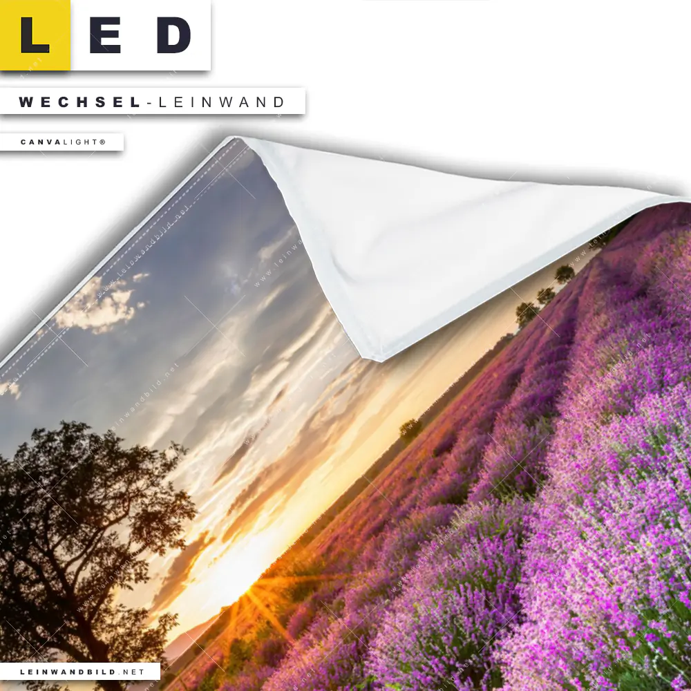 LED Wechsel-Leinwand Canvalight® TEX | Sonnenaufgang im Lavendelfeld | Querformat