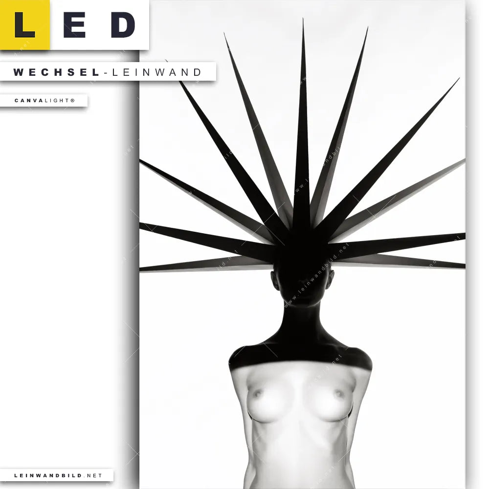 Dann sollte die Wechsel-Leinwand Canvalight® TEX | Sonnengöttin | Hochformat den Weg zu Dir finden. Die Austausch-Leinwand Kopf mit schwarzen Spitzen als Sonnengöttin-Symbol - passend für unsere stufenlos dimmbaren, steckerfertigen Leinwandbilder im Leuchtrahmen mit Fernbedienung und optionaler Farbtemperatursteuerung - fügt sich als Eye-Catcher harmonisch in jedes Bar - Gastronomie, Flur - Eingangsbereich, Wohnzimmer - Schlafzimmer Raumkonzept ein.