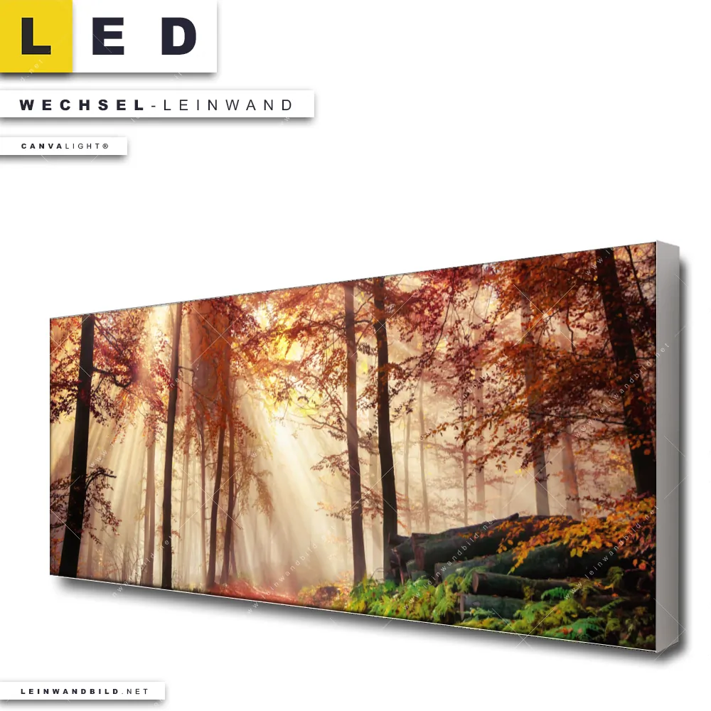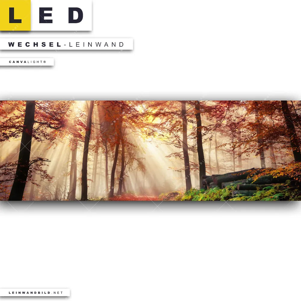 LED Wechsel-Leinwand Canvalight® TEX | Sonnenlicht im nebligen Wald | Panorama