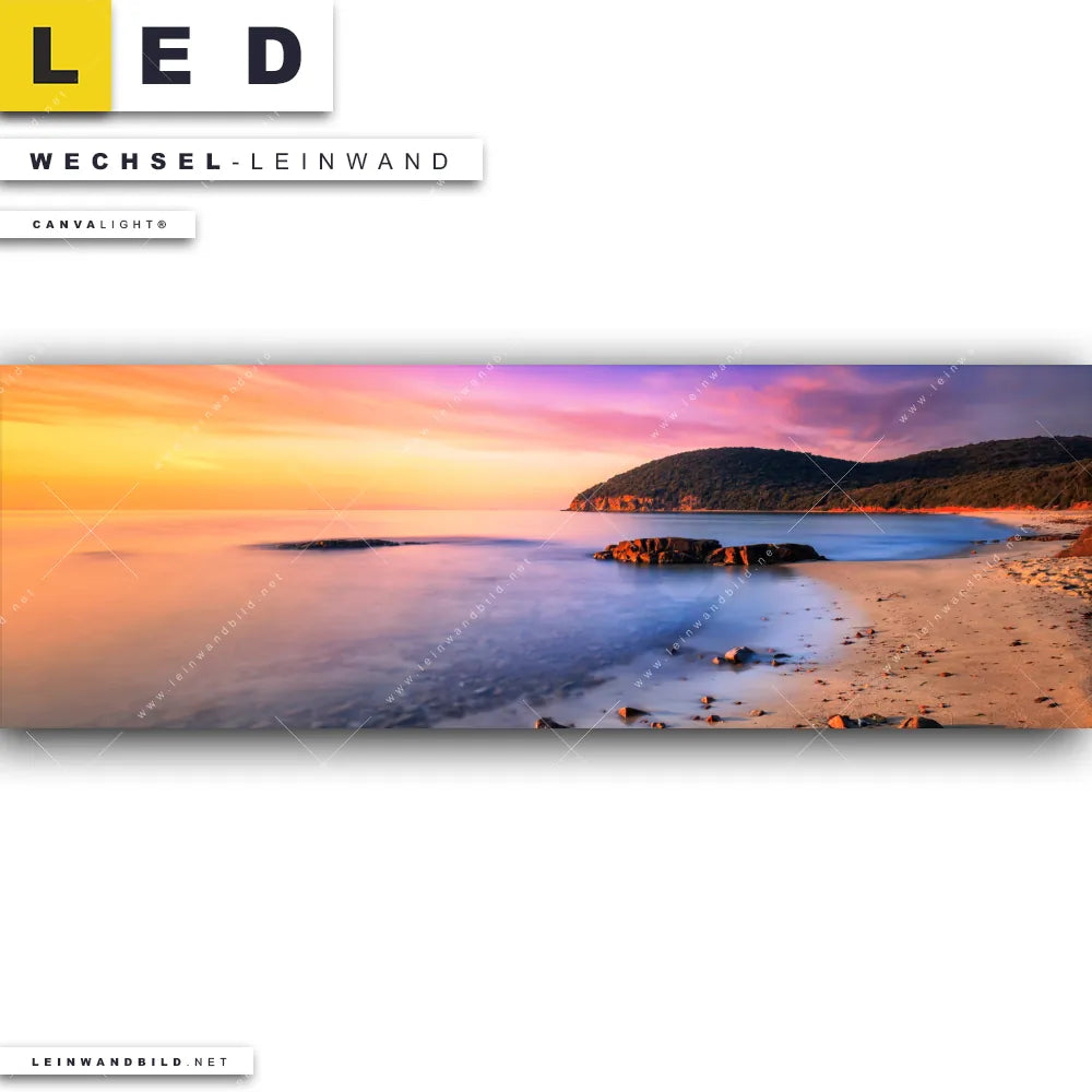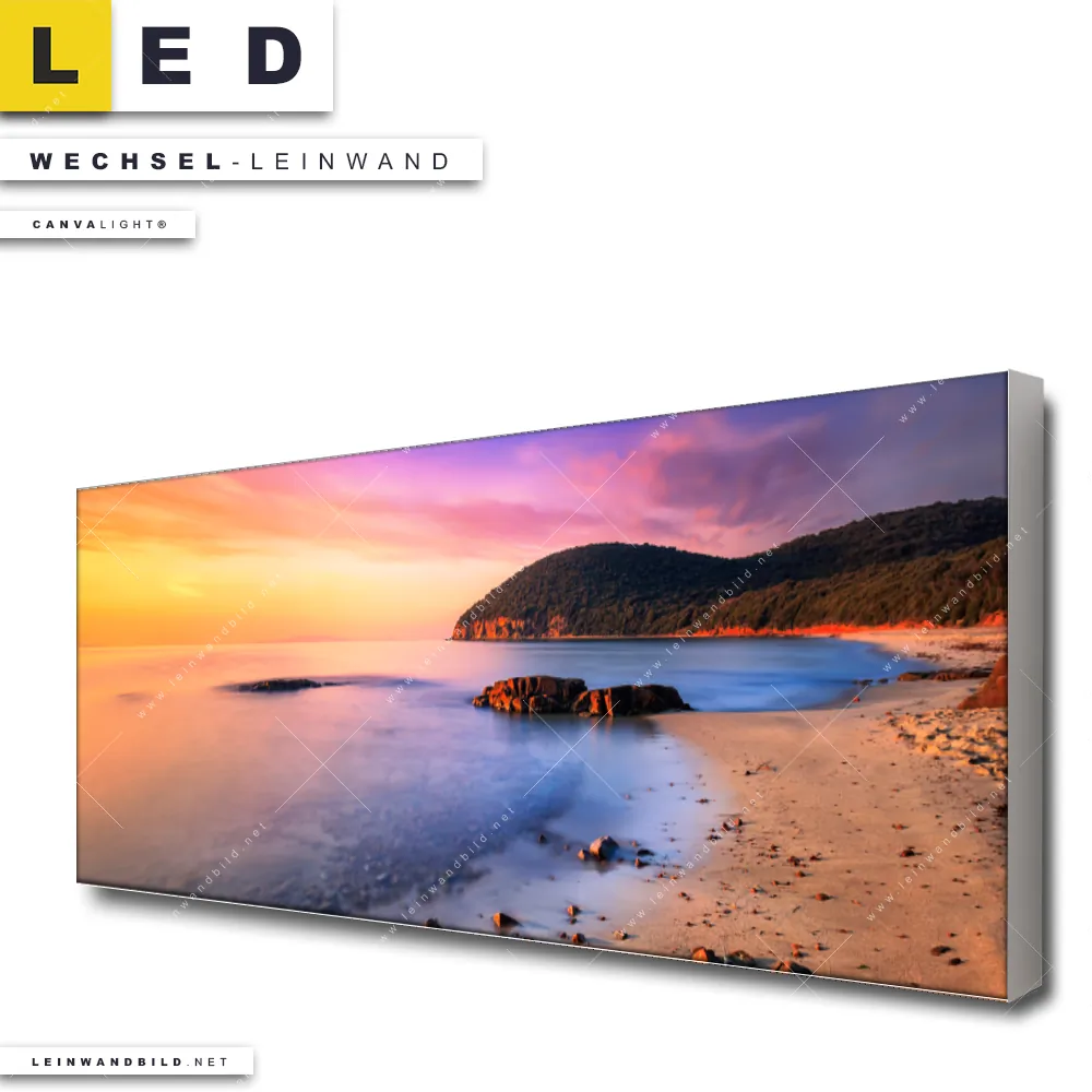 Du konfigurierst Deine individuelle LED Wechsel-Leinwand Canvalight® TEX | Sonnenuntergang in Bucht | Panorama und wir produzieren sie NEU für Dich. Unsere Landschaften, Strand - Meer Austausch-Fotoleinwände für Canvalight® LED Bilder sind KEINE Lagerware. Du bist Dir unsicher, welches Motiv oder Format das richtige für dein individuelles LED Wechselmotiv auf Leinwand ist, dann helfen wir dir gerne weiter und beraten dich!