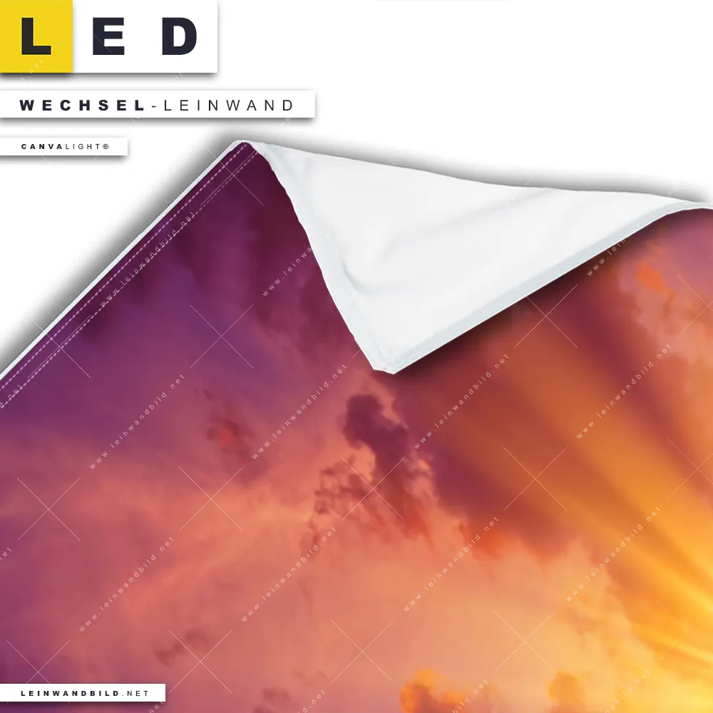 Bitte beachte, dass die Farben, der auf dem Monitor abgebildeten farbenfroher Sonnenuntergang Darstellung, möglicherweise von den Originalfarben deiner Canvalight® TEX Wechsel-Leinwand abweichen können.