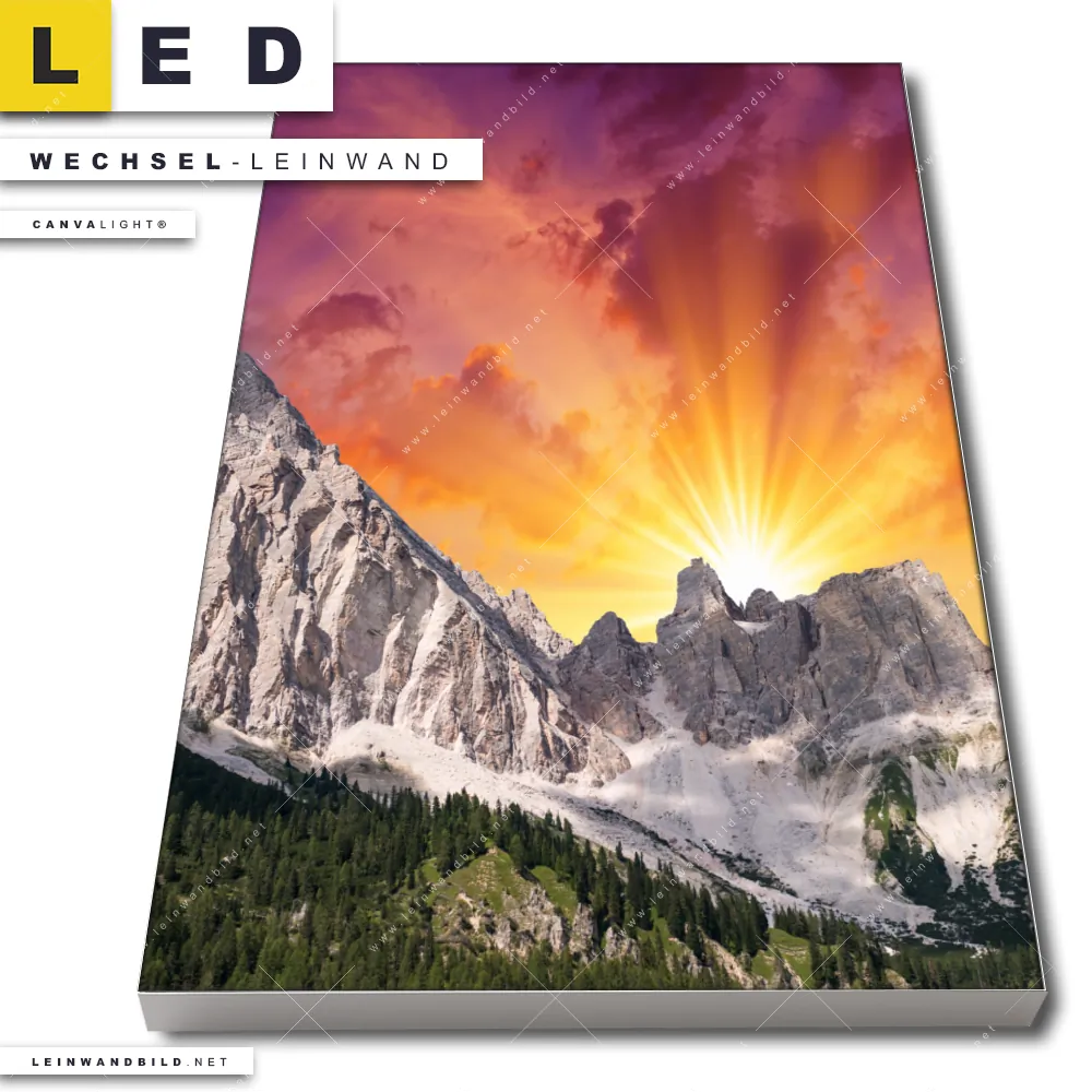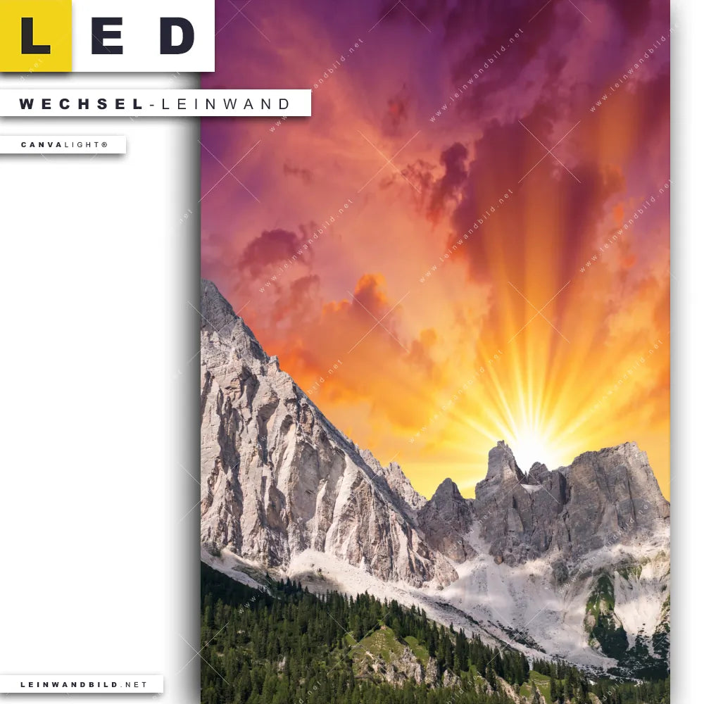 LED Wechsel-Leinwand Canvalight® TEX | Sonnenuntergang in den Bergen | Hochformat
