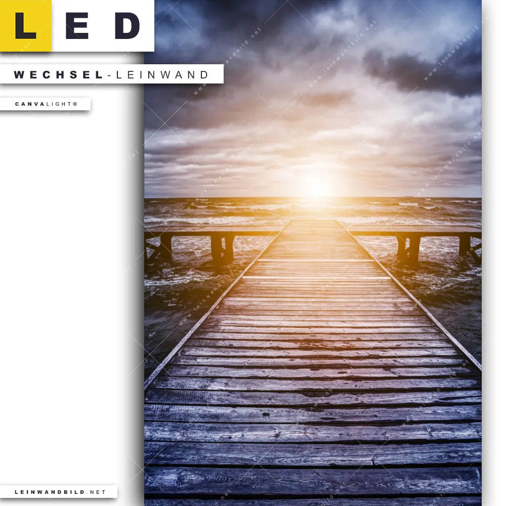 Dann sollte die Wechsel-Leinwand Canvalight® TEX | Sonnenuntergang & Meer | Hochformat den Weg zu Dir finden. Die Austausch-Leinwand Holzsteg zum Sonnenuntergang - passend für unsere stufenlos dimmbaren, steckerfertigen Leinwandbilder im Leuchtrahmen mit Fernbedienung und optionaler Farbtemperatursteuerung - fügt sich als Eye-Catcher harmonisch in jedes Büro - Kanzlei, Wohnzimmer - Schlafzimmer Raumkonzept ein.
