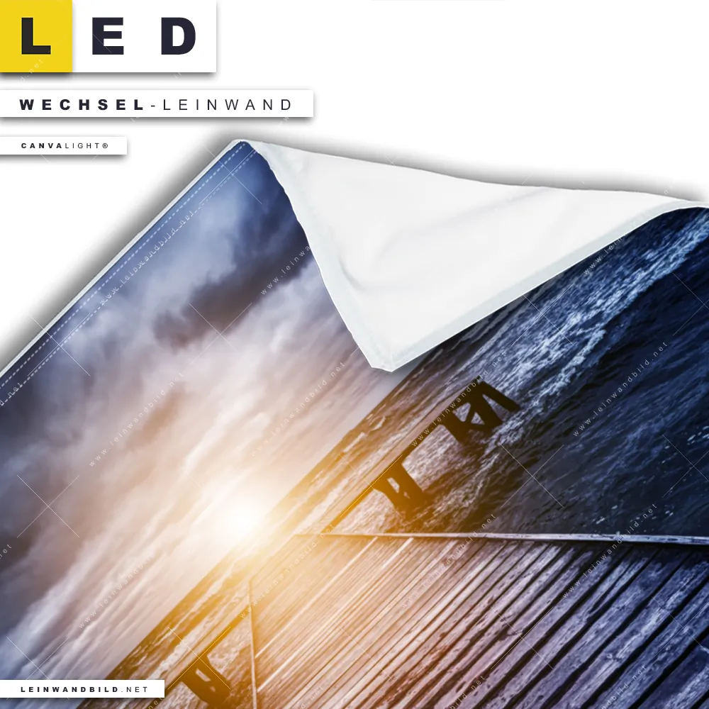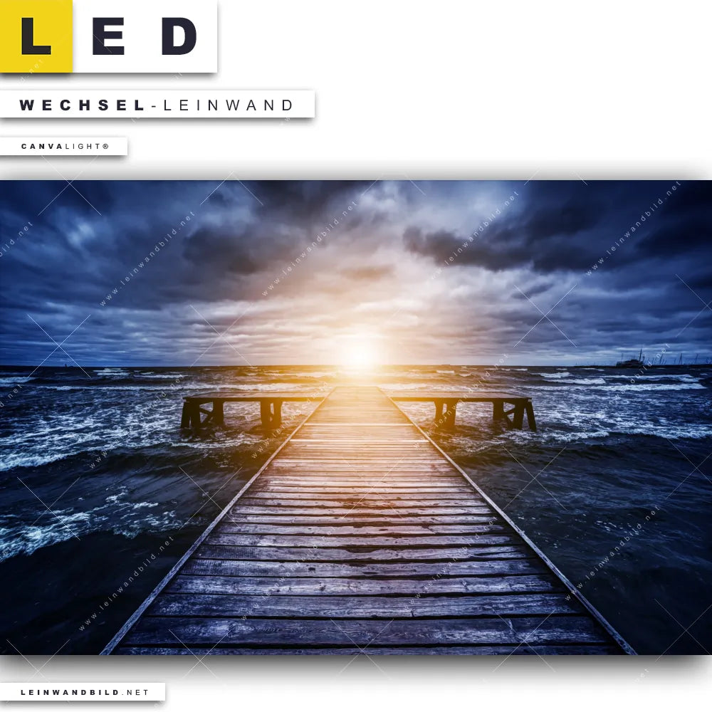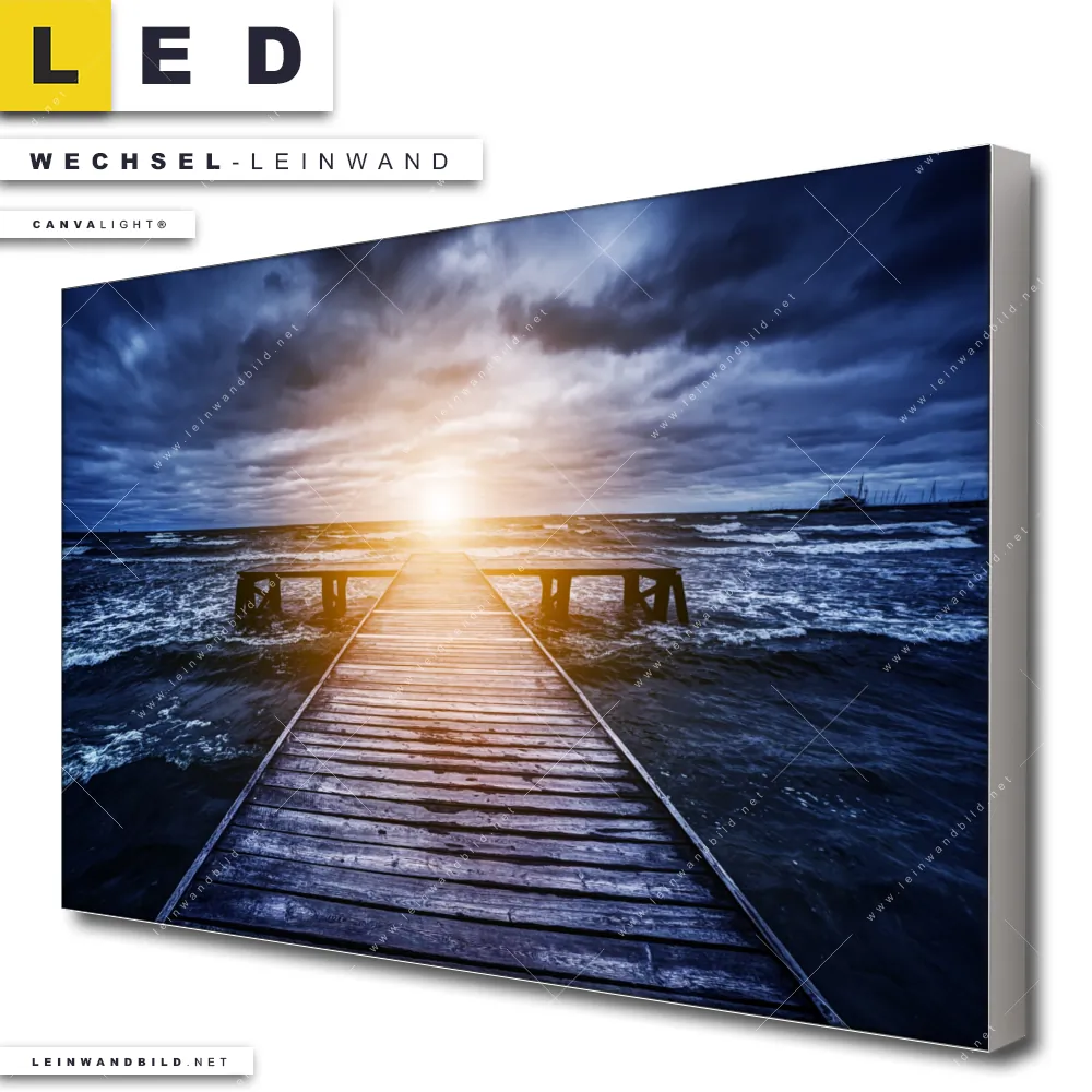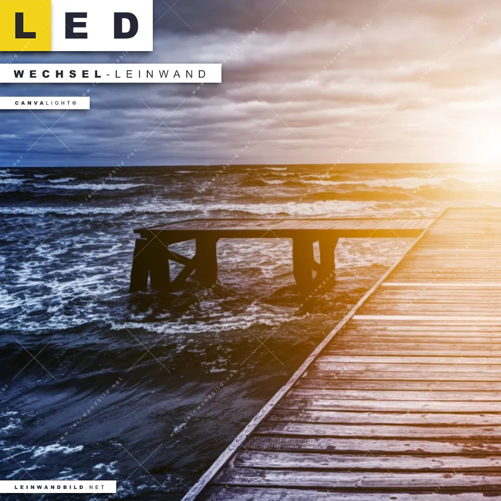 Dann sollte die Wechsel-Leinwand Canvalight® TEX | Sonnenuntergang & Meer | Querformat den Weg zu Dir finden. Die Austausch-Leinwand Steg am rauschenden Meer - passend für unsere stufenlos dimmbaren, steckerfertigen Leinwandbilder im Leuchtrahmen mit Fernbedienung und optionaler Farbtemperatursteuerung - fügt sich als Eye-Catcher harmonisch in jedes Büro - Kanzlei, Wohnzimmer - Schlafzimmer Raumkonzept ein.