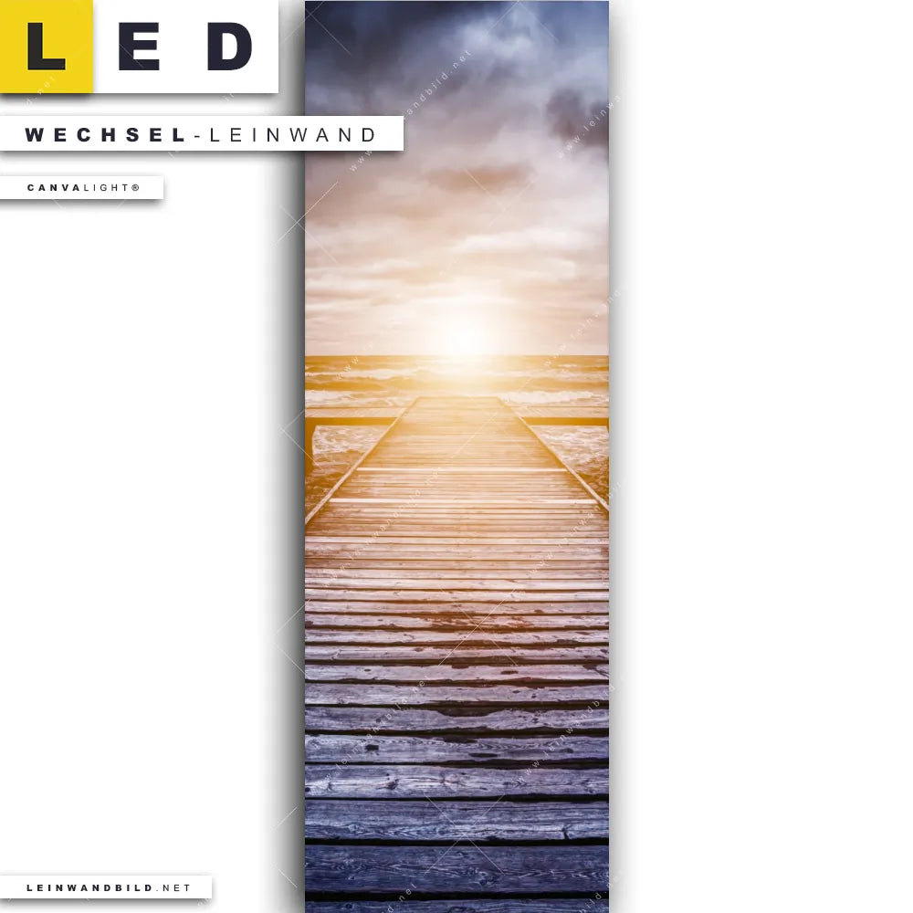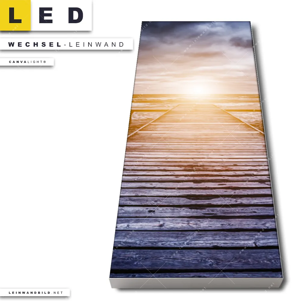Dann sollte die Wechsel-Leinwand Canvalight® TEX | Sonnenuntergang & Meer | Schmal den Weg zu Dir finden. Die Austausch-Leinwand Holzsteg im brausenden Meer - passend für unsere stufenlos dimmbaren, steckerfertigen Leinwandbilder im LED Leuchtrahmen mit Fernbedienung und optionaler Farbtemperatursteuerung - fügt sich als Eye-Catcher harmonisch in jedes Büro - Kanzlei, Wohnzimmer - Schlafzimmer Raumkonzept ein.