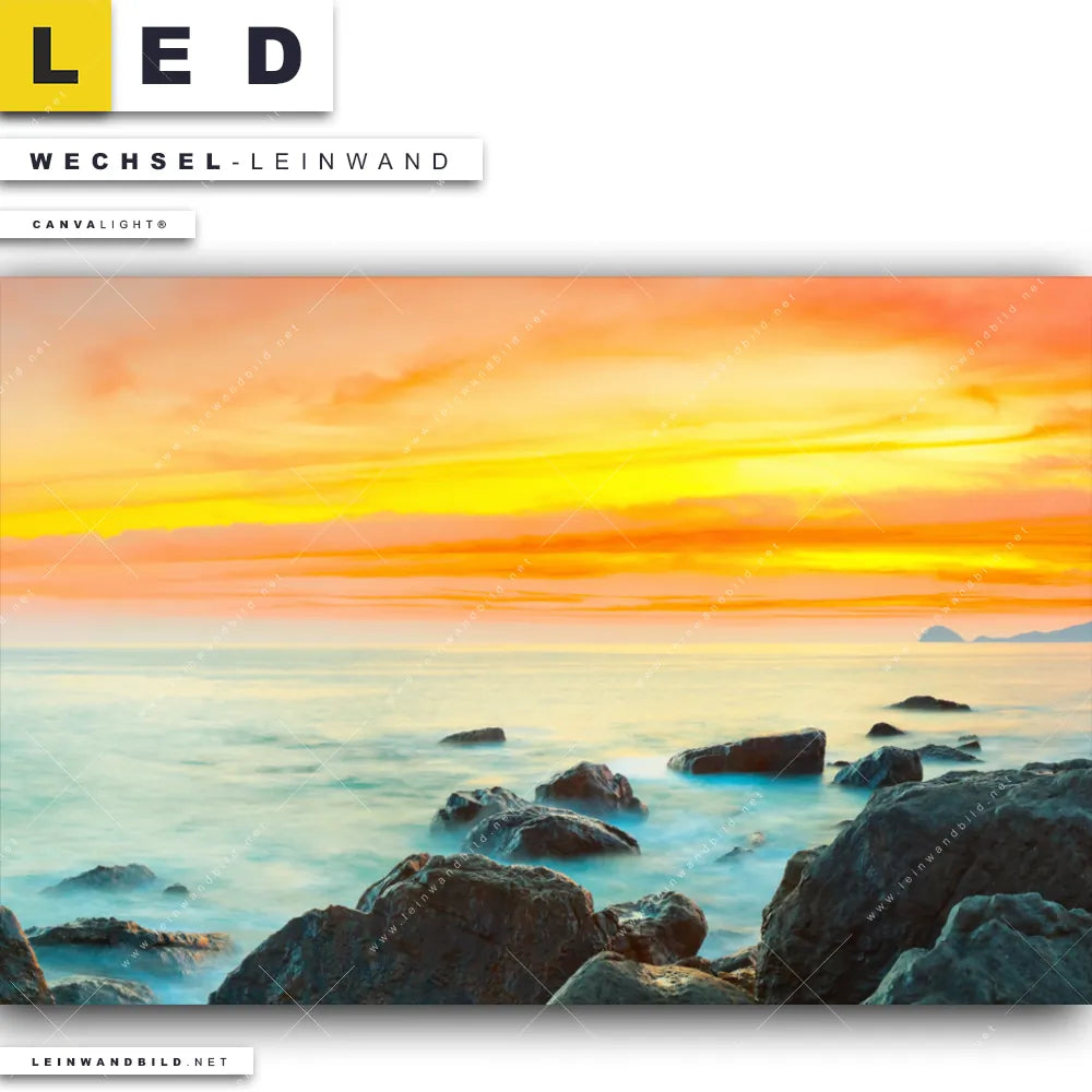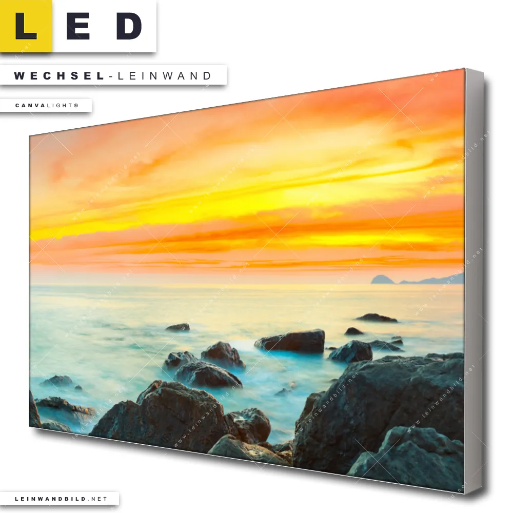 Dann sollte die Wechsel-Leinwand Canvalight® TEX | Sonnenuntergang über dem Meer | Querformat den Weg zu Dir finden. Die Austausch-Leinwand Sonnenuntergang Steinküste - passend für unsere stufenlos dimmbaren, steckerfertigen Leinwandbilder im Leuchtrahmen mit Fernbedienung und optionaler Farbtemperatursteuerung - fügt sich als Eye-Catcher harmonisch in jedes Arzt - Praxis, Bar - Gastronomie, Büro - Kanzlei, Wohnzimmer - Schlafzimmer Raumkonzept ein.