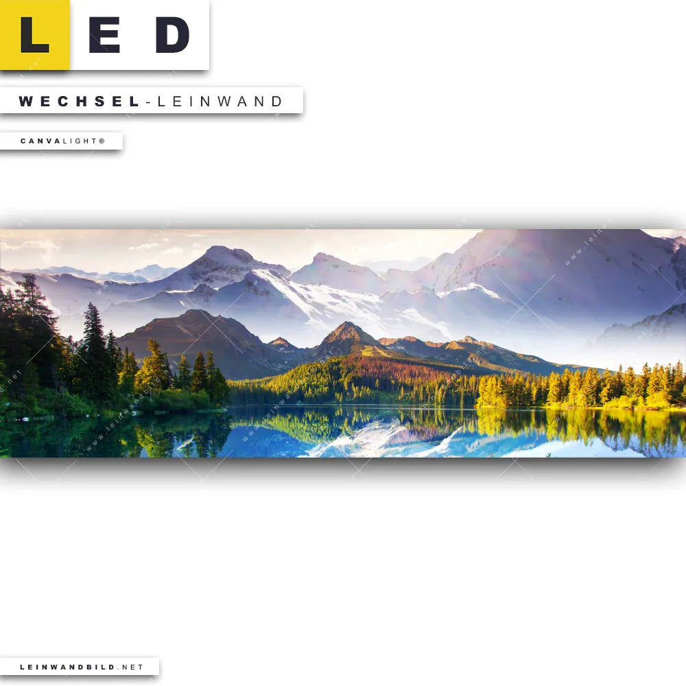 Du bist auf der Suche nach einer Landschaften Wechsel-Leinwand für Dein LED-Leinwandbild im Panorama-Format? Begriffe wie Natur, Stille, See, Wasser, Berge, Sonnenuntergang, Sonnenaufgang, Sonne, Gebirge, Bergsee, Bäume, Wald, Wasserspiegelung haben Dich auf der Suche nach Deiner Ersatz-Leinwand für dein extra breites LED Wandbild mit wechselbarer Leinwand inspiriert? Farben wie Orange, Blau, Grün dürfen auf Deinem neuen Wechselmotiv für Dein XXL Leinwand-LED-Bild nicht fehlen und Leinwände im Natürlich - Realistisch Stil für Leuchtbilder passen perfekt zu Deinem Einrichtungsstil?
