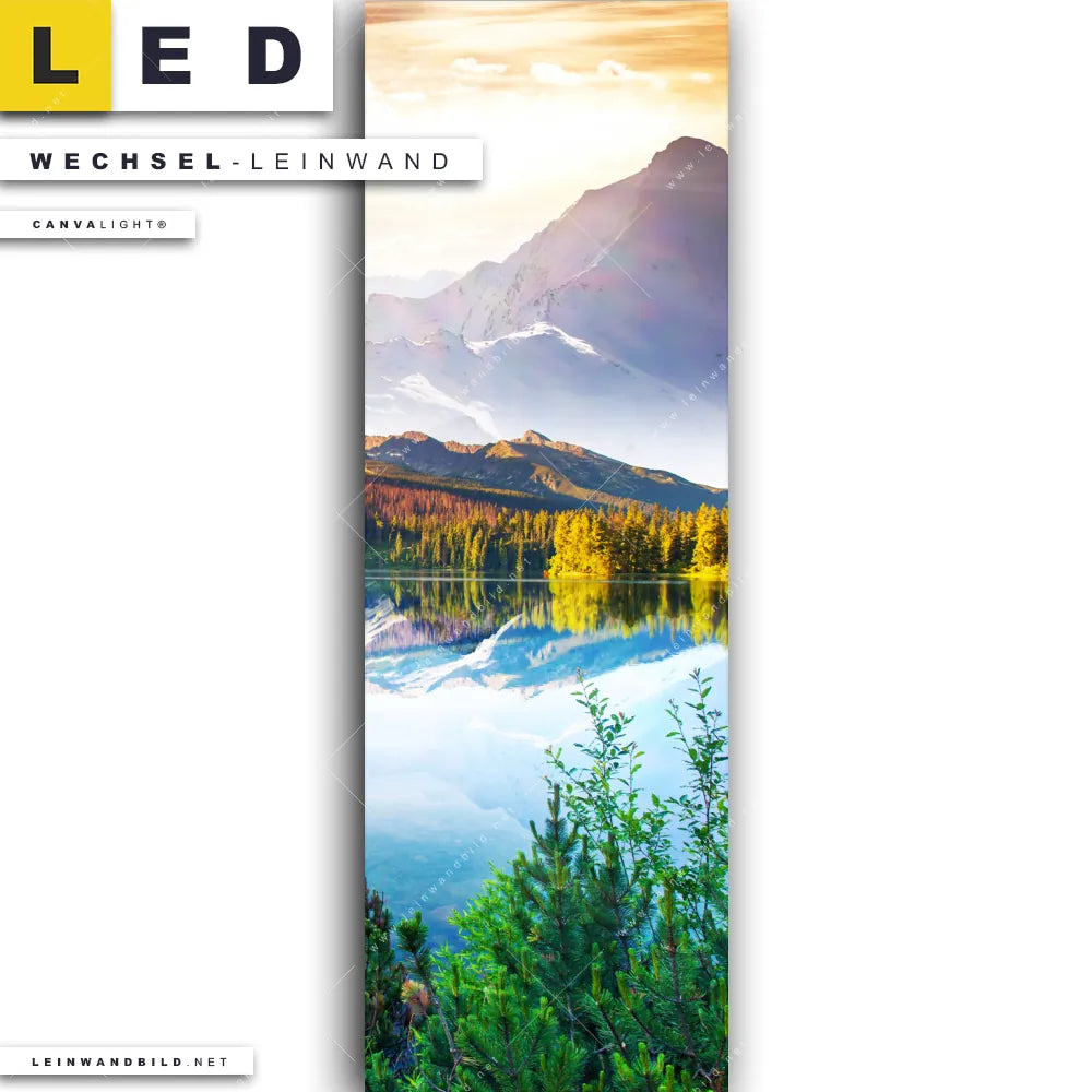 Du bist auf der Suche nach einer Landschaften Wechsel-Leinwand für Dein LED-Leinwandbild im Schmalen Format? Begriffe wie Natur, Stille, See, Wasser, Berge, Sonnenuntergang, Sonnenaufgang, Sonne, Gebirge, Bergsee, Bäume, Wald, Wasserspiegelung haben Dich auf der Suche nach Deiner Ersatz-Leinwand für dein LED Wandbild im Panorama-Hochformat mit wechselbarer Leinwand inspiriert? Farben wie Orange, Blau, Grün dürfen auf Deinem neuen Wechselmotiv für Dein XXL Leinwand-LED-Bild nicht fehlen und Leinwände im Natürlich - Realistisch Stil für Leuchtbilder passen perfekt zu Deinem Einrichtungsstil?