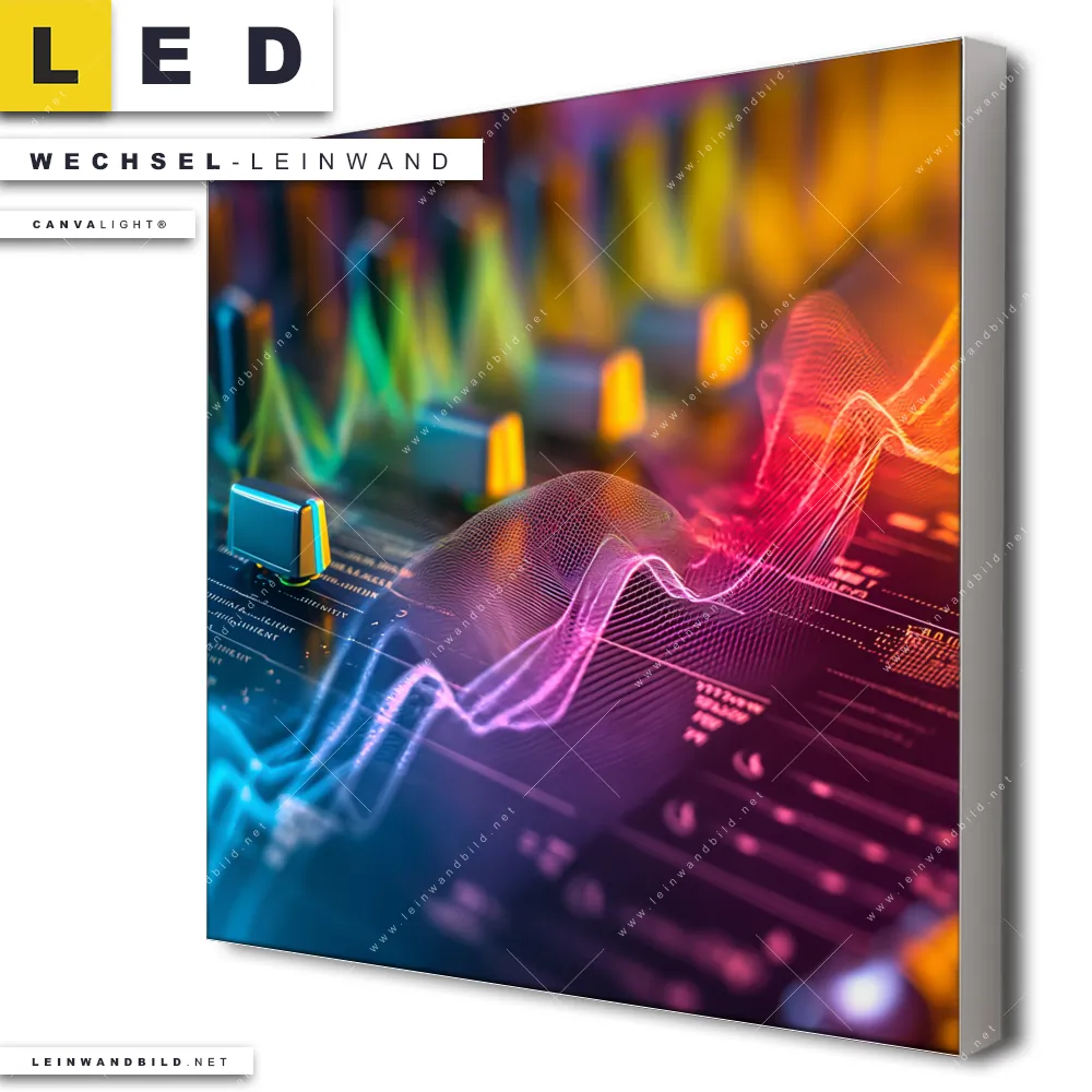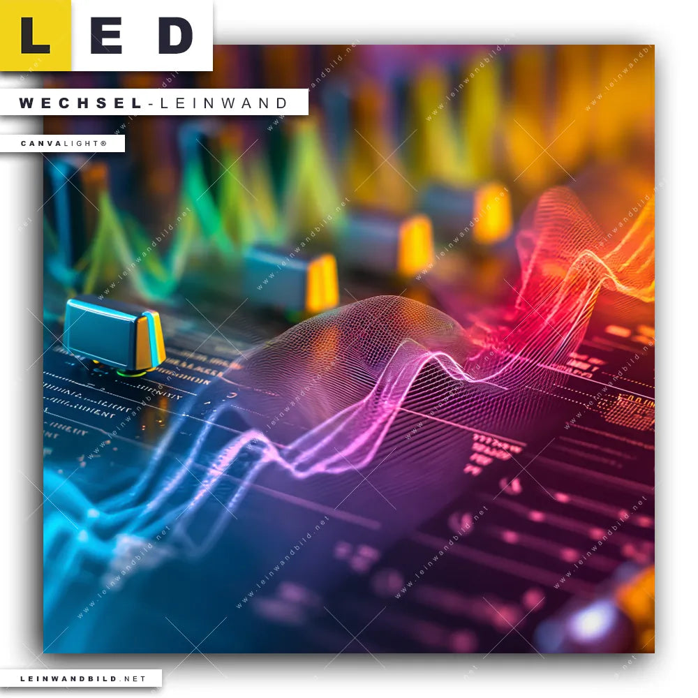 Dann sollte die Wechsel-Leinwand Canvalight® TEX | Sound Wave | Quadrat den Weg zu Dir finden. Die Austausch-Leinwand Bunte Sound Waves über Mischpult - passend für unsere stufenlos dimmbaren, steckerfertigen Leinwandbilder im Leuchtrahmen mit Fernbedienung und optionaler Farbtemperatursteuerung - fügt sich als Eye-Catcher harmonisch in jedes Wohnzimmer - Schlafzimmer, Bar - Gastronomie, Büro - Kanzlei, Flur - Eingangsbereich, Kinderzimmer Raumkonzept ein.
