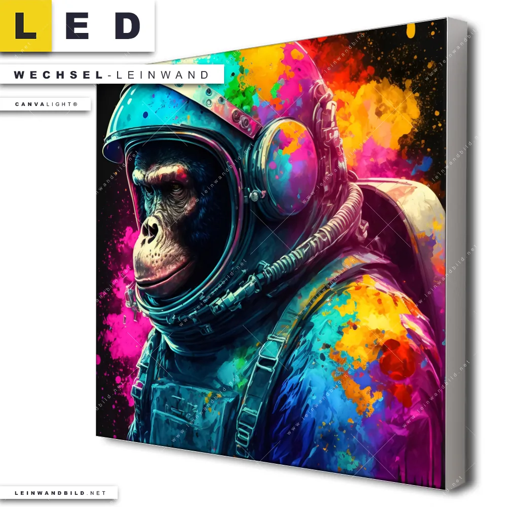 Du bist auf der Suche nach einer Tierwelt Wechsel-Leinwand für Dein LED-Leinwandbild im Quadratischen Format? Begriffe wie Tier, Affe, Monkey, Chimpanzee, Schimpanse, Farbe, Farbspritzer, Austronaut, Weltall, Space haben Dich auf der Suche nach Deiner Ersatz-Leinwand für dein LED Wandbild mit wechselbarer Leinwand inspiriert? Farben wie Bunt, Schwarz dürfen auf Deinem neuen Wechselmotiv für Dein XXL Leinwand-LED-Bild nicht fehlen und Leinwände im Abstrakt, Modern Art, Pop Art Stil für Leuchtbilder passen perfekt zu Deinem Einrichtungsstil?